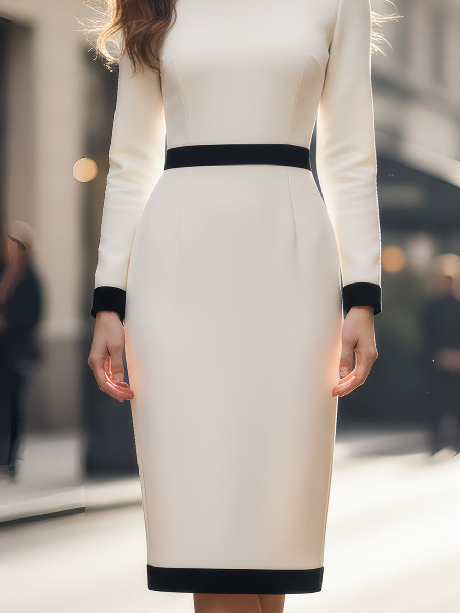 - Design: Classic round neckline with contrast binding, long sleeves, fitted waistline, and mid-length pencil skirt; minimal seaming for a sleek finish