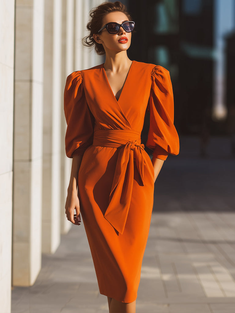 Bold, vibrant, and effortlessly flattering, the Tangerine Satin Wrap Dress makes a statement without saying a word. Designed in a striking tangerine hue, this dress features a wrap design that creates a flattering V-neckline and a sash belt that cinches the waist for an elegant silhouette. The voluminous puffed sleeves and midi-length hem add drama and sophistication, making it the perfect choice for special occasions or upscale dinners. The smooth satin fabric catches the light beautifully, exuding a luxurious and contemporary aesthetic.