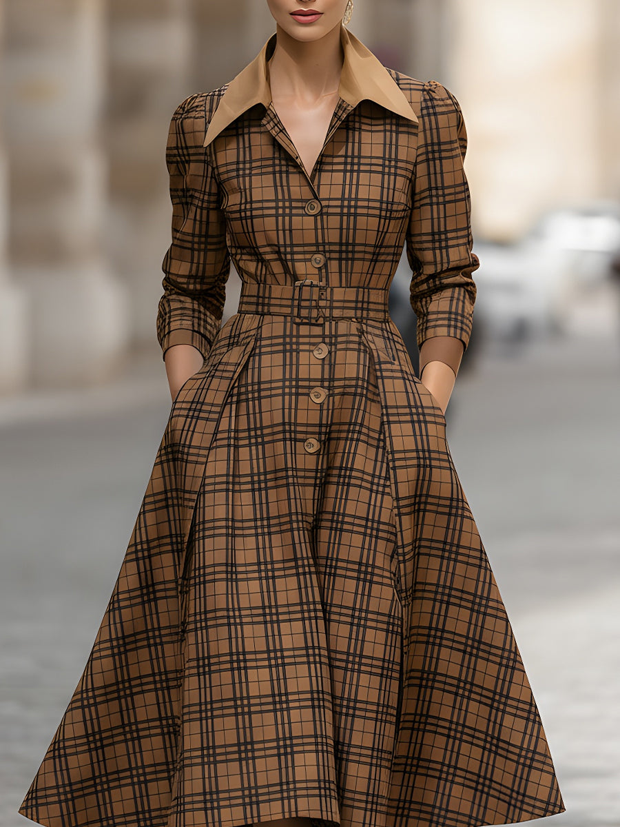 This effortlessly chic plaid shirt dress with a modern twist. Featuring a statement contrast collar in camel, this dress combines classic plaid print with contemporary styling. The A-line silhouette, long sleeves, and belted waist create a flattering and feminine look, perfect for both casual and semi-formal occasions.