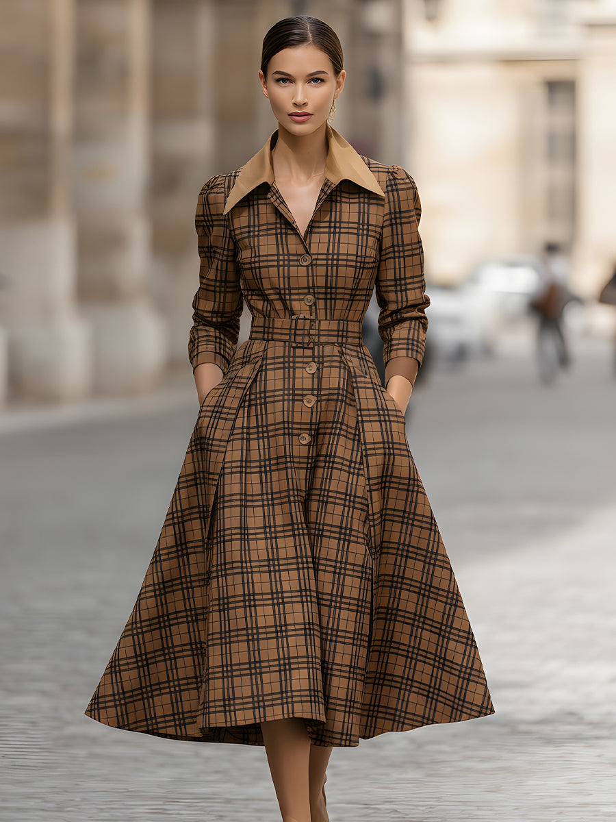 This plaid shirt dress offers a timeless yet fresh look with its classic plaid design and contrast collar, blending sophistication with a touch of casual charm. The pleated skirt and side pockets add functional detail, while the belt allows for a customized, flattering fit. Pair it with heels or flats for a versatile outfit that can seamlessly transition from day to night.