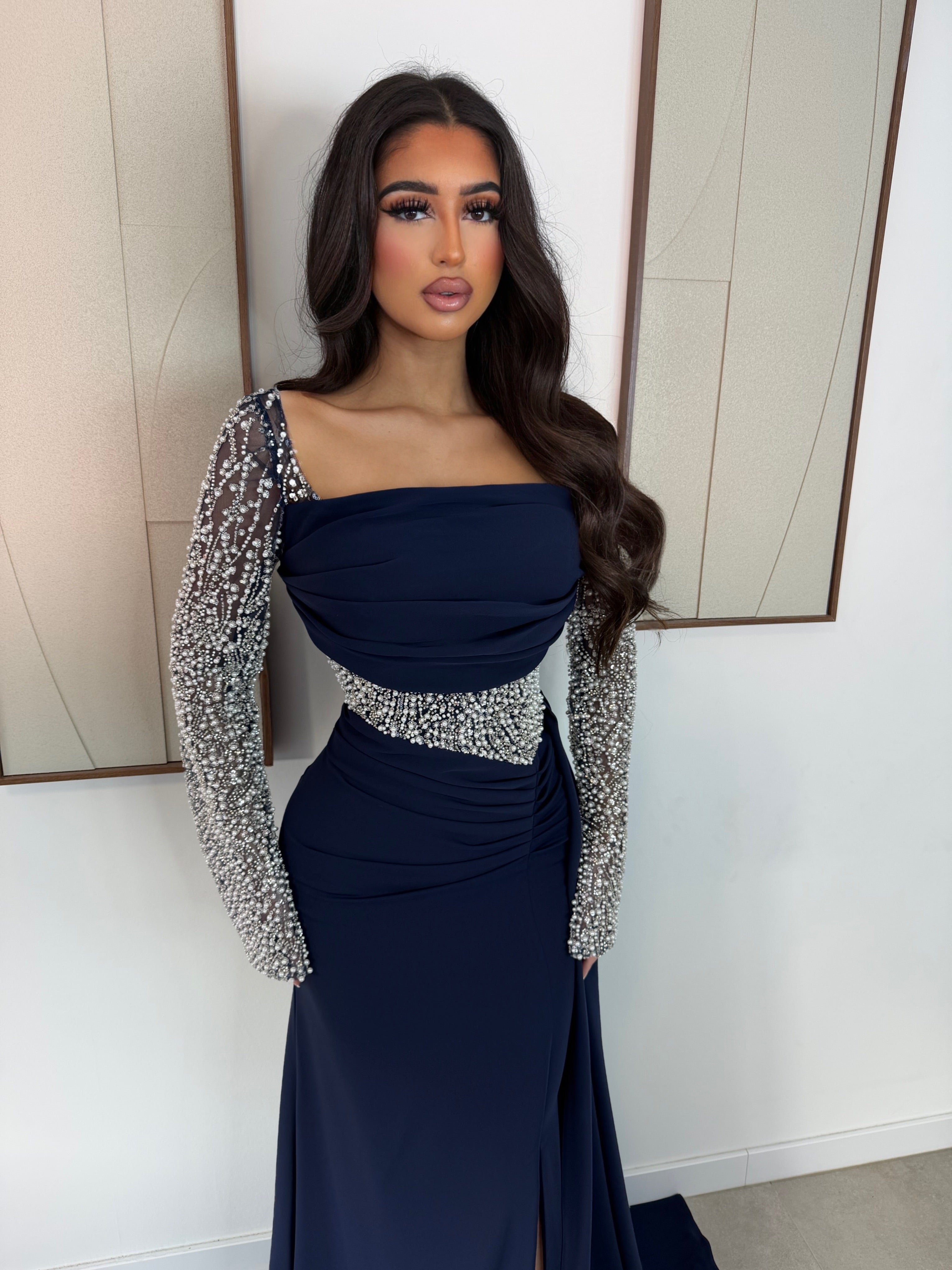 Elevate your evening elegance with this navy square neck gown, where refined details create an unforgettable silhouette. The long beaded sleeves add a touch of glamour and movement, while the strategic slit provides modern sophistication and ease of wear. Perfect for galas, formal dinners, or special occasions, this dress combines timeless style with contemporary flair. The structured square neckline flatters the shoulders, and the flowing fabric drapes beautifully for a polished, graceful appearance that commands attention.