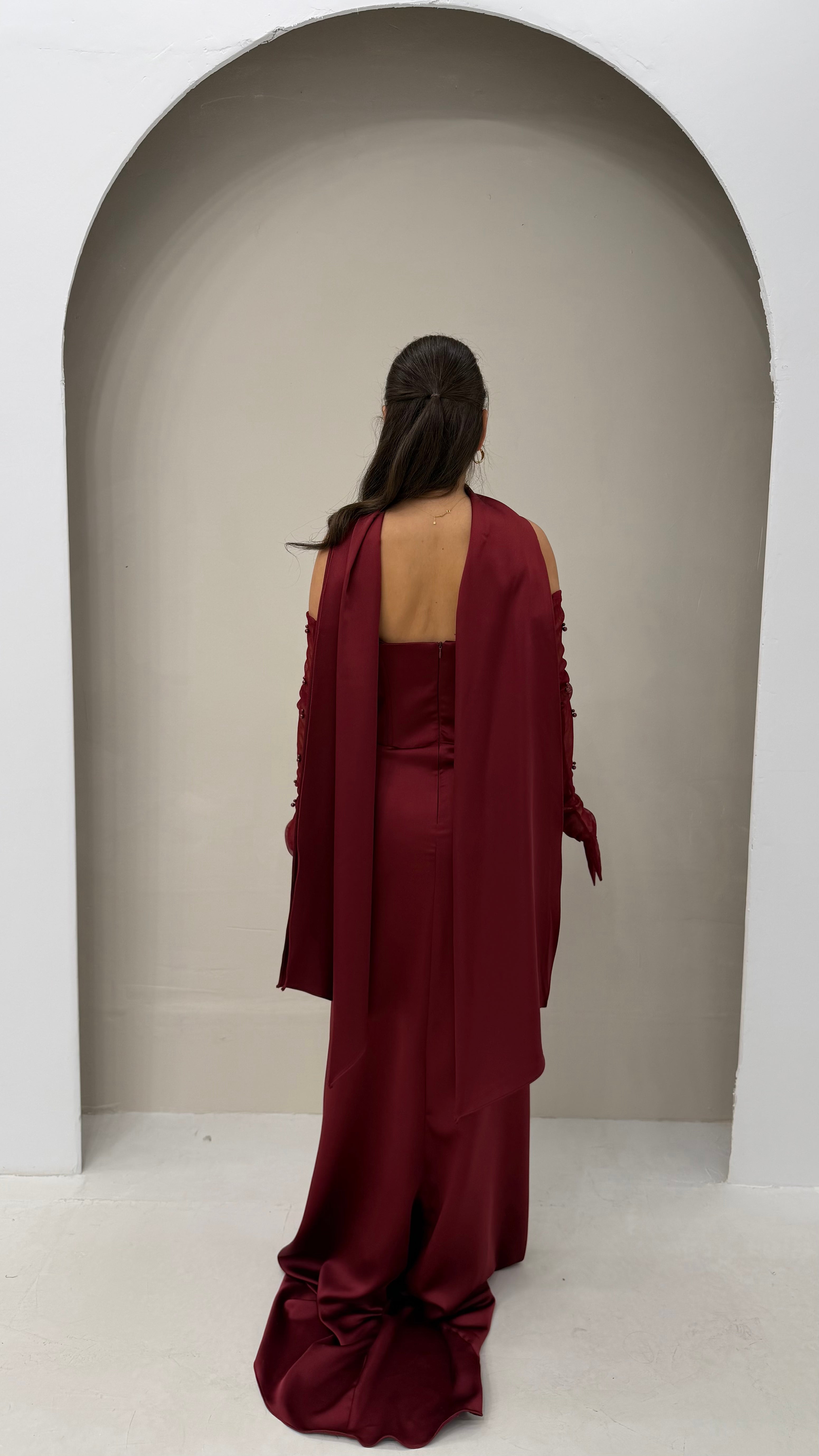 Burgundy Strapless Pleated Mermaid Evening Dress with Scarf