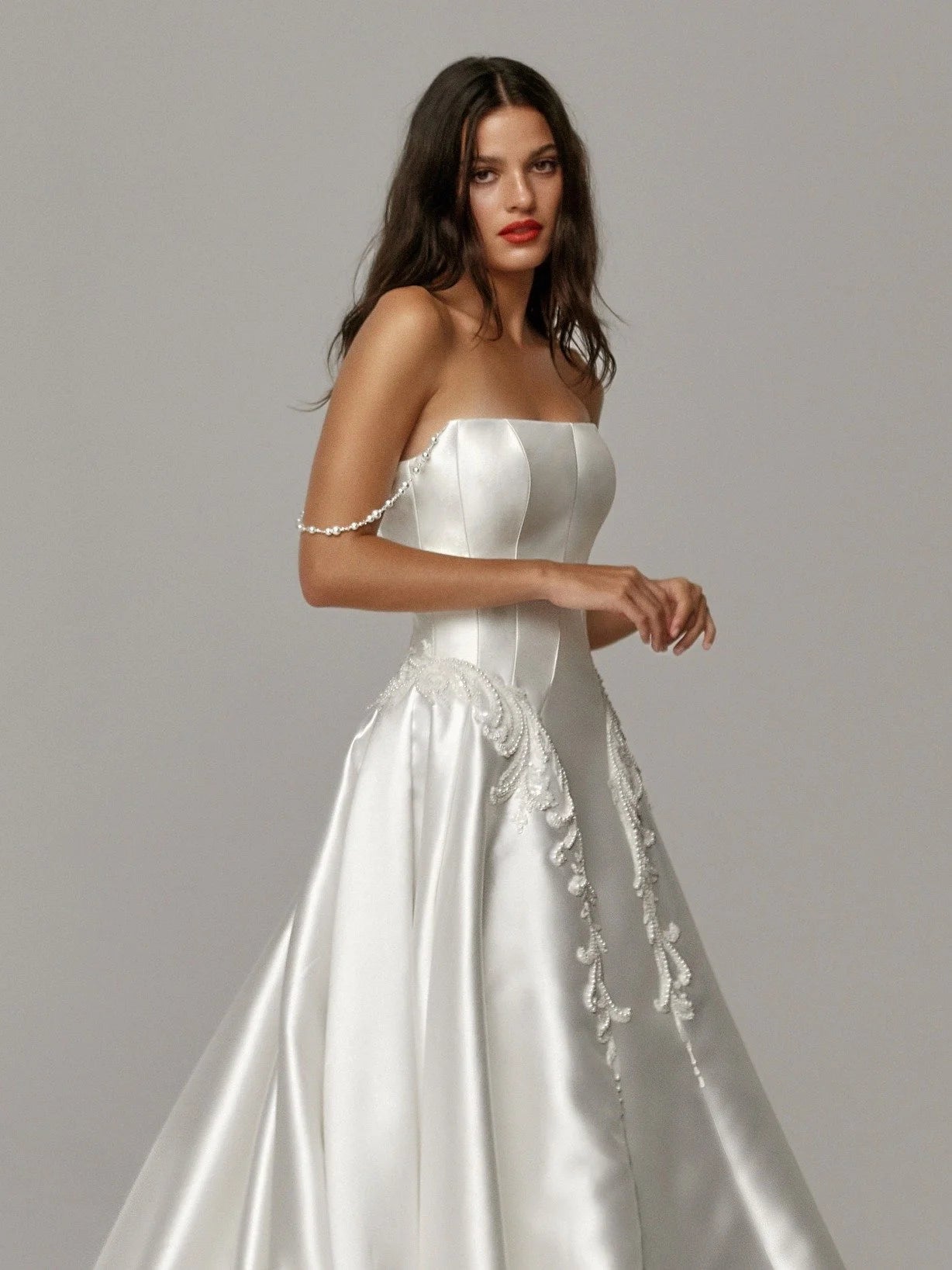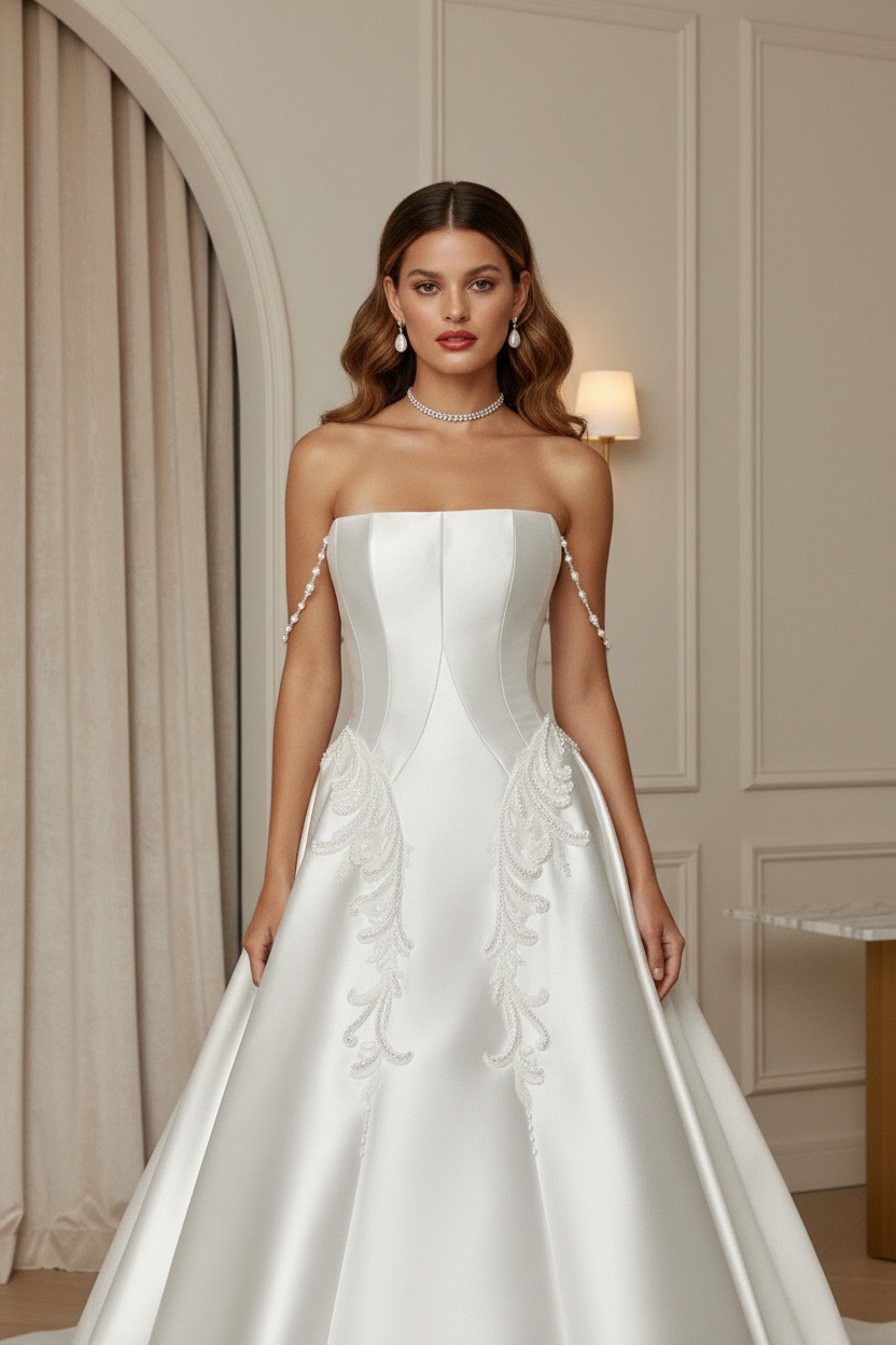 Walk down the aisle in timeless elegance with this stunning off-shoulder wedding dress. Crafted from luxurious satin, the A-line silhouette flatters every figure while the chapel train creates a dramatic, romantic finish. Delicate pearl beading adorns the neckline and bodice, catching light with every step. The off-shoulder design offers a modern, sophisticated touch that balances classic bridal beauty. Perfect for the bride seeking understated glamour and refined style on her special day.