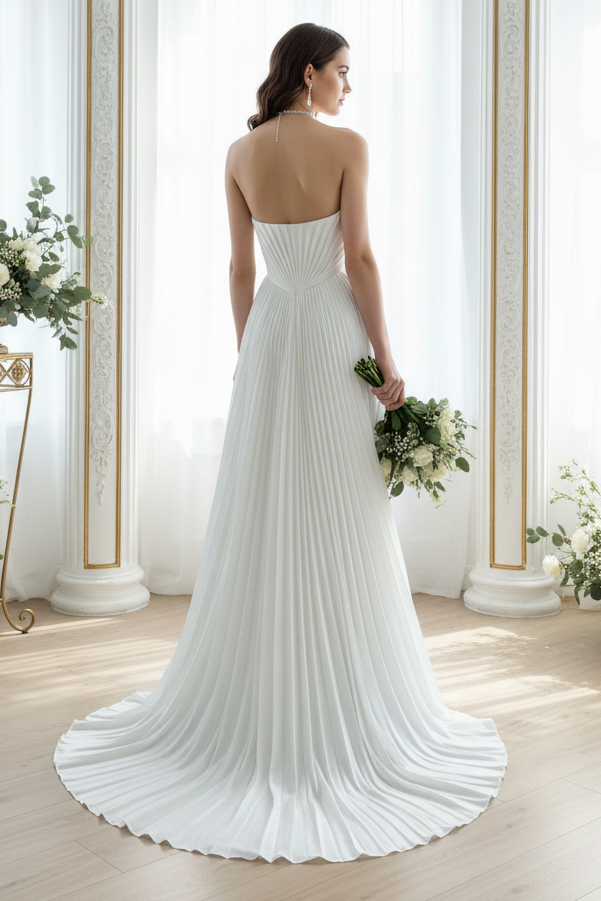 Elegant tube top wedding dress featuring delicate pleating and graceful draped details that flow into a sweeping train. The strapless neckline offers a timeless silhouette, while the structured bodice provides support and flattering shaping. Soft fabric gathers create romantic movement throughout the skirt, culminating in a dramatic sweep train that adds sophistication and presence as you walk. Perfect for a classic, refined bridal look that photographs beautifully and moves with ease. Ideal for traditional and modern ceremonies alike.