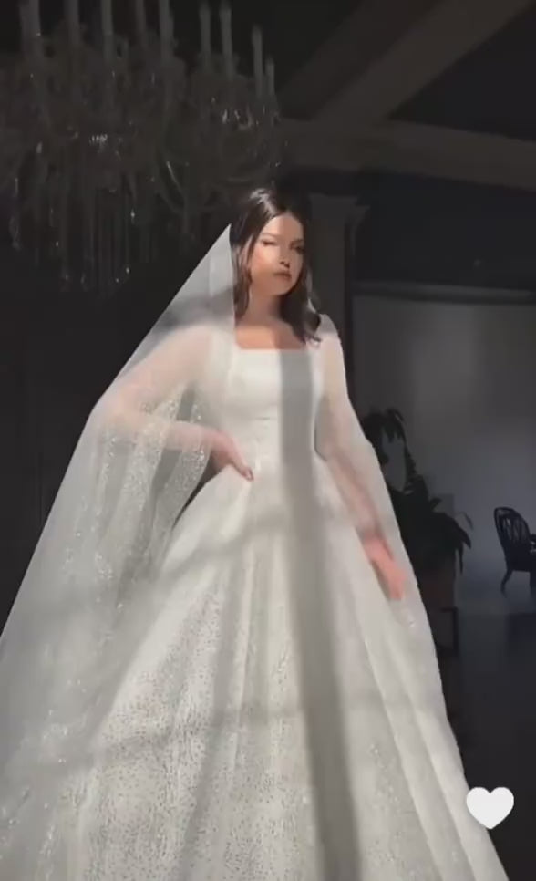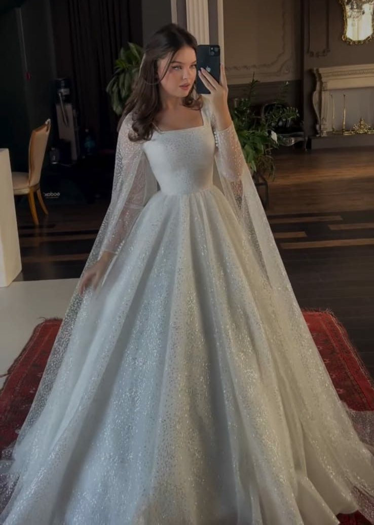 Elegant A-line silhouette with a graceful square neckline and long sleeves creates a timeless bridal look. Intricate beading adorns the bodice and flows down the skirt, catching light with every movement. The flowing skirt provides comfortable movement while maintaining a sophisticated, romantic aesthetic. Perfect for brides seeking a classic yet detailed wedding gown that balances modesty with glamour. This dress celebrates traditional bridal elegance with contemporary craftsmanship.