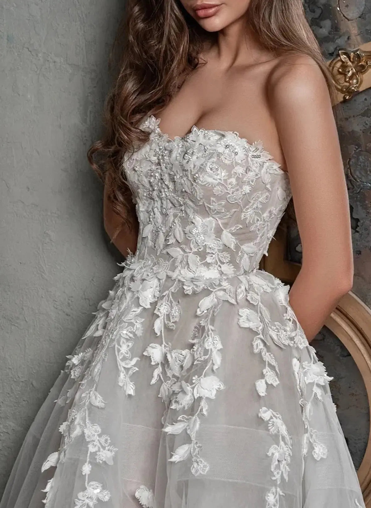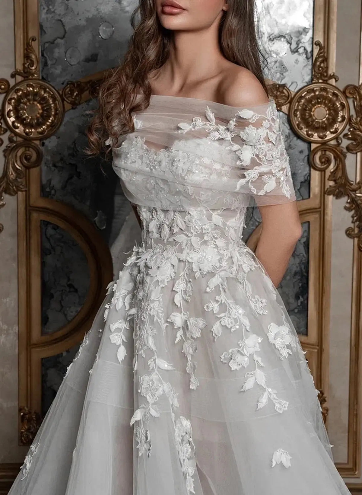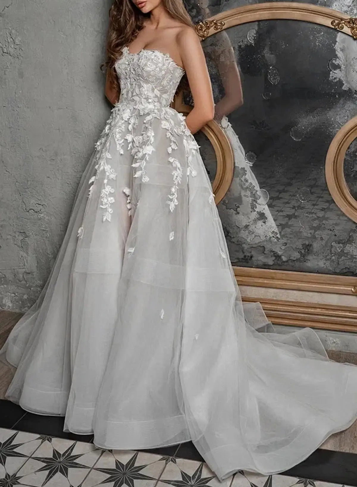 Timeless elegance meets modern versatility in this stunning sleeveless wedding dress. The classic A-line silhouette flatters every figure, while delicate lace and tulle create an ethereal, romantic aesthetic. The detachable neckline allows you to customize your look—wear it as designed or remove it for a different style throughout your celebration. A graceful sweep train adds drama and sophistication as you walk down the aisle. Perfect for the bride who wants both tradition and flexibility on her special day.