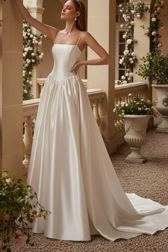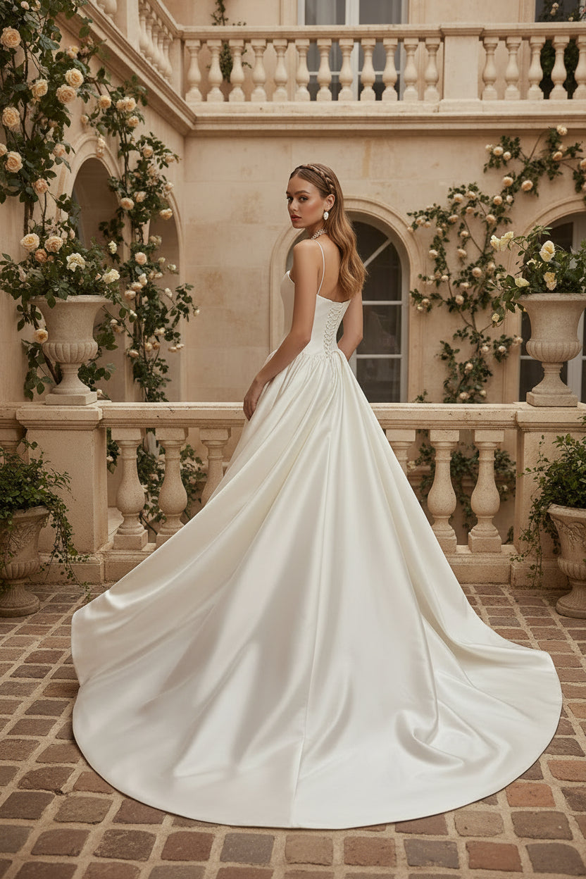 Elegant satin ball gown wedding dress featuring delicate spaghetti straps and a sleeveless silhouette. The luxurious satin fabric drapes beautifully, creating a voluminous skirt that commands attention as you walk down the aisle. The fitted bodice accentuates your curves while the flowing skirt provides graceful movement and timeless romance. Perfect for brides seeking a classic, sophisticated look with modern refinement. This dress combines traditional elegance with contemporary design, making it an unforgettable choice for your special day.