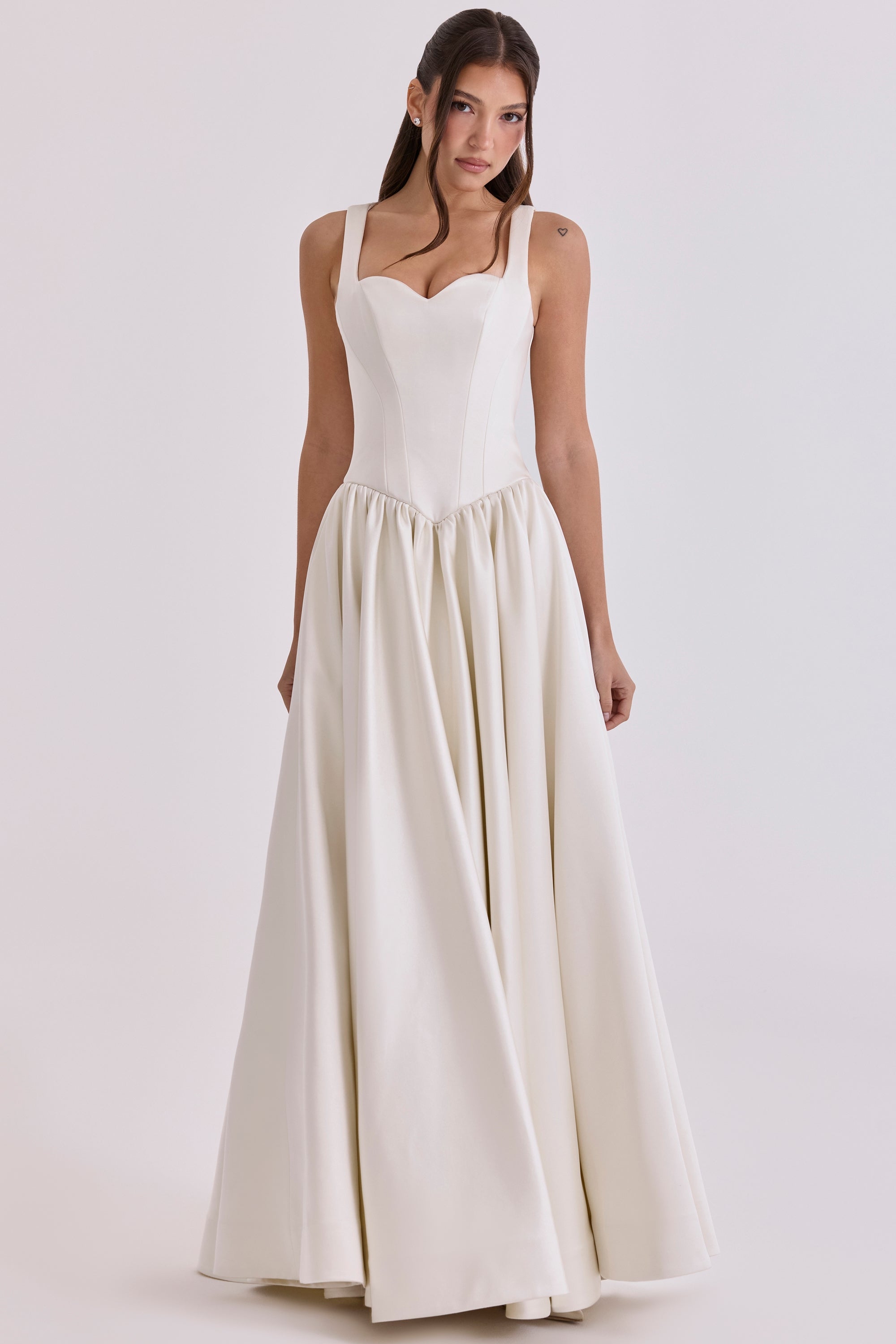 Elegant satin bridal gown featuring a structured basque waist corset bodice that sculpts and flatters your silhouette. The fitted corset design transitions seamlessly into a graceful A-line skirt, creating a timeless hourglass shape. Crafted from luxurious satin fabric with a smooth, lustrous finish that catches light beautifully. Perfect for brides seeking classic sophistication with modern construction. The corset boning provides support and comfort throughout your special day, while the flowing A-line skirt allows ease of movement. An ideal choice for traditional and contemporary wedding celebrations alike.