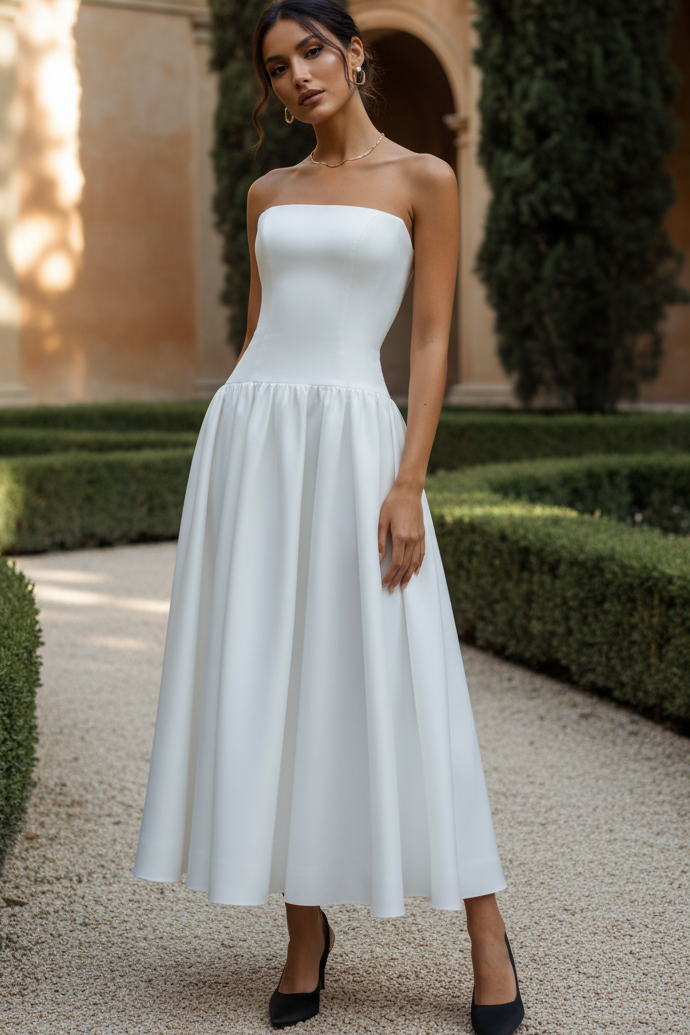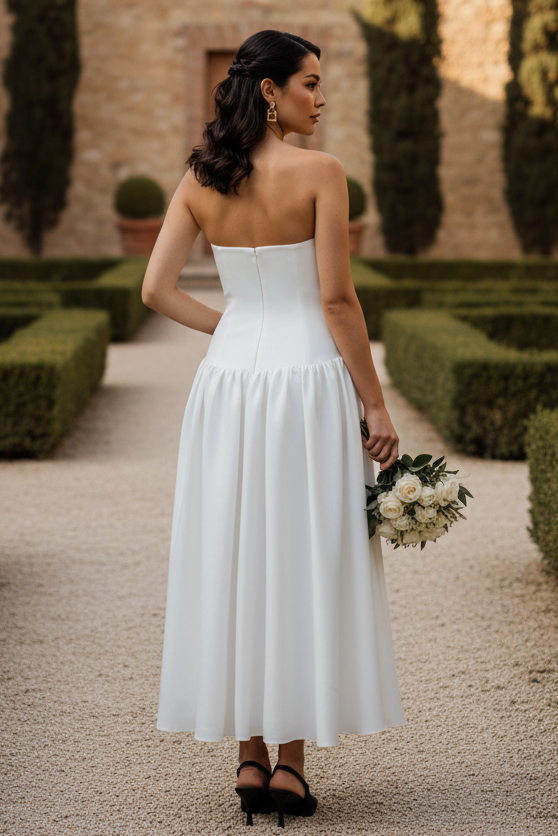 Elegant simplicity meets timeless style with this tube-top A-line midi wedding dress. The strapless design creates a romantic silhouette, while the flowing A-line skirt offers graceful movement and comfort. Perfect for intimate ceremonies, courthouse weddings, or casual celebrations, this midi-length gown strikes the ideal balance between sophistication and ease. The clean lines and understated elegance make it versatile enough to dress up or down, and the midi length provides a modern alternative to traditional floor-length styles. An effortless choice for the bride who values comfort without compromising on beauty.