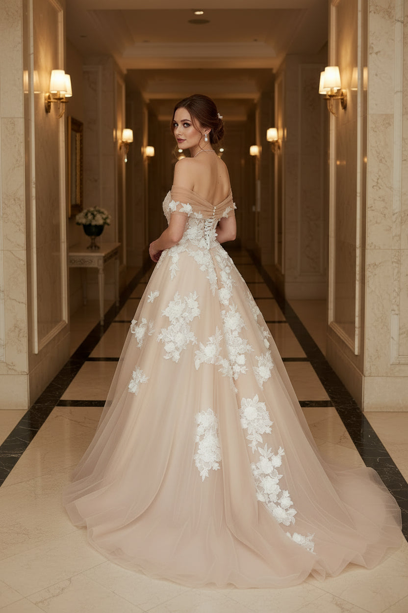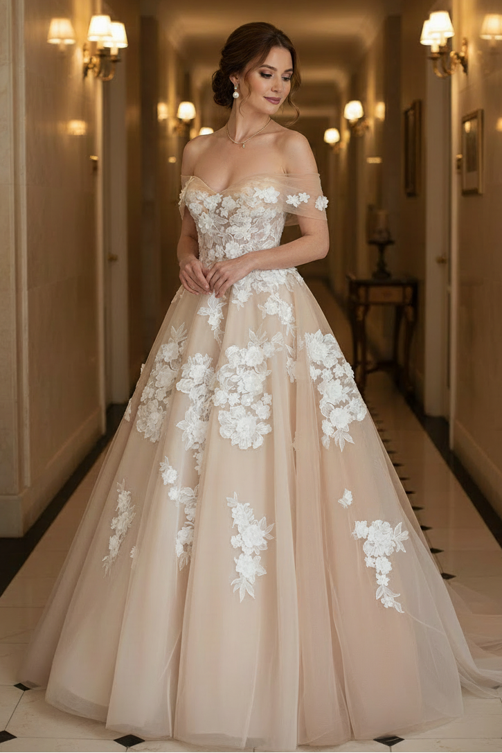 Embrace timeless elegance in this romantic wedding dress, crafted from luxurious nude tulle that drapes beautifully. The off-the-shoulder neckline creates a graceful, feminine silhouette while the classic A-line cut flatters every figure. Delicate white 3D flowers cascade across the bodice and skirt, adding dimension and romantic charm. Perfect for the bride who wants understated sophistication with eye-catching details. This gown combines modern design with traditional bridal beauty, ensuring you feel confident and radiant on your special day.