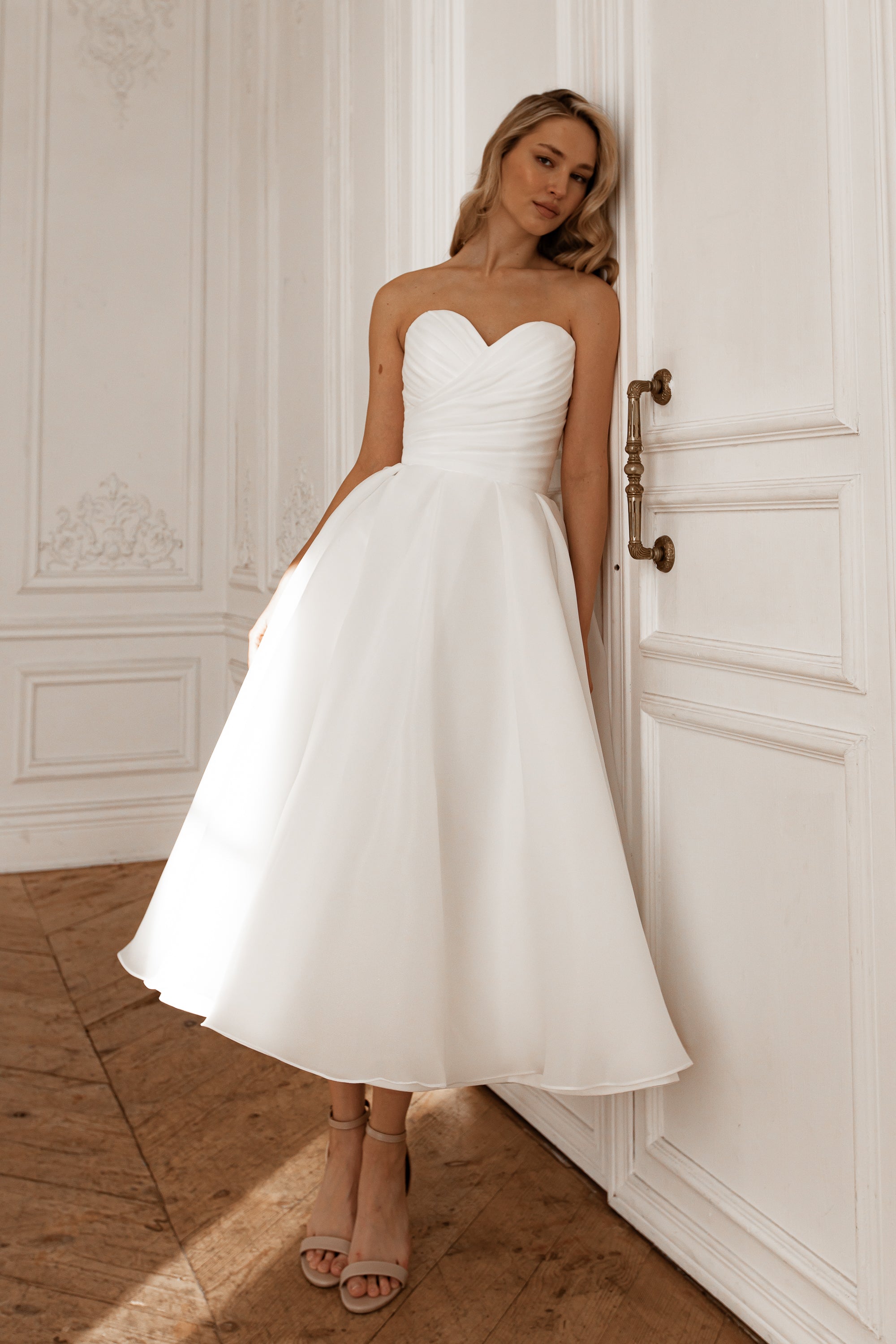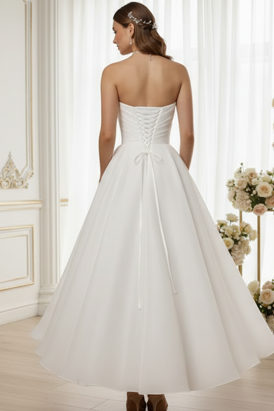 Elegant and timeless, this sweetheart neckline wedding dress features delicate pleating throughout the bodice for a refined silhouette. The classic A-line cut flatters all figures while the lightweight organza fabric drapes beautifully. The midi length offers a modern twist on traditional bridal wear, perfect for intimate ceremonies or receptions. Intricate pleating details add dimension and movement, creating a romantic, sophisticated look. Ideal for brides seeking comfort without compromising on style.