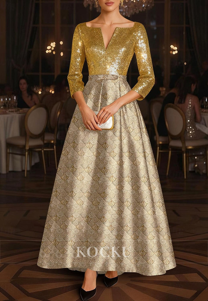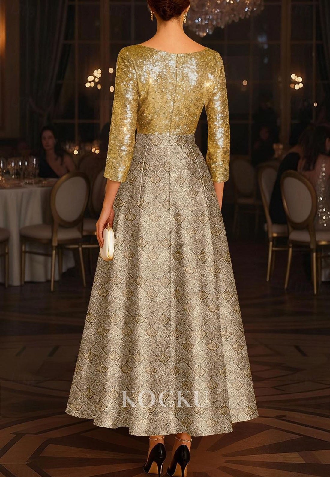 Embrace understated elegance in this refined A-line gown, thoughtfully designed for the modern mother of the bride. The three-quarter sleeves strike the perfect balance between coverage and sophistication, while the V-neckline creates a flattering, elongating silhouette. Delicate beading adorns the bodice and skirt, adding subtle luminosity and refined detail without overwhelming the design. The flowing A-line cut provides comfortable movement and flatters all body types, while the back zipper closure delivers a polished, seamless finish. This versatile piece combines classic proportions with contemporary craftsmanship, ensuring you look poised and radiant throughout the celebration.