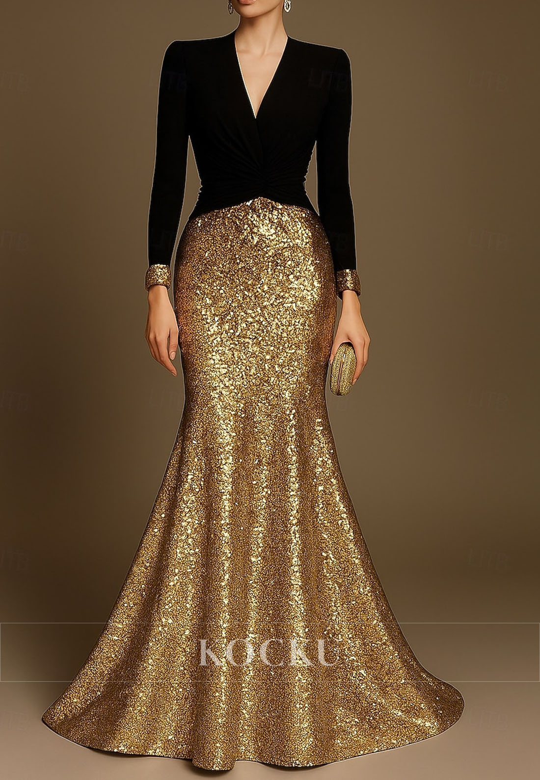 Mermaid Floor Length Evening Gown Half Sleeve V Neck Mother of the Bride Dress - Gold está en espera y se enviará tan pronto como vuelva a estar en stock