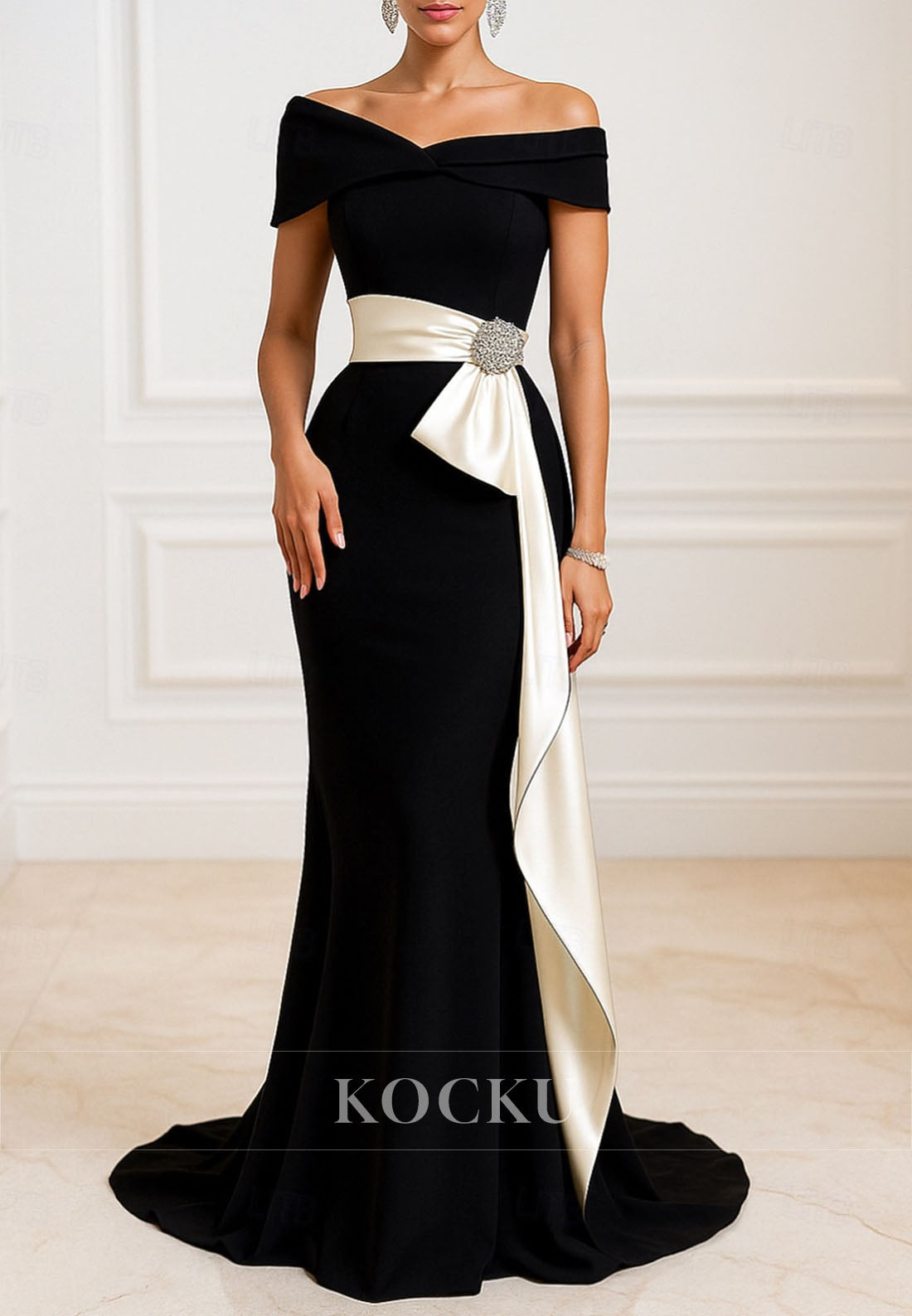 Captivate in this stunning off-shoulder mermaid gown, expertly designed for the mother of the bride who embraces romantic elegance. The off-shoulder neckline beautifully frames the collarbone and shoulders, creating a graceful, feminine silhouette with contemporary appeal. The fitted mermaid cut hugs your curves with precision before flowing into a dramatic sweep train that commands attention and presence. Luxurious fabric drapes beautifully, ensuring comfort and confidence throughout the celebration. This show-stopping design balances classic mermaid proportions with modern styling, delivering the sophistication and allure you deserve on this cherished occasion.