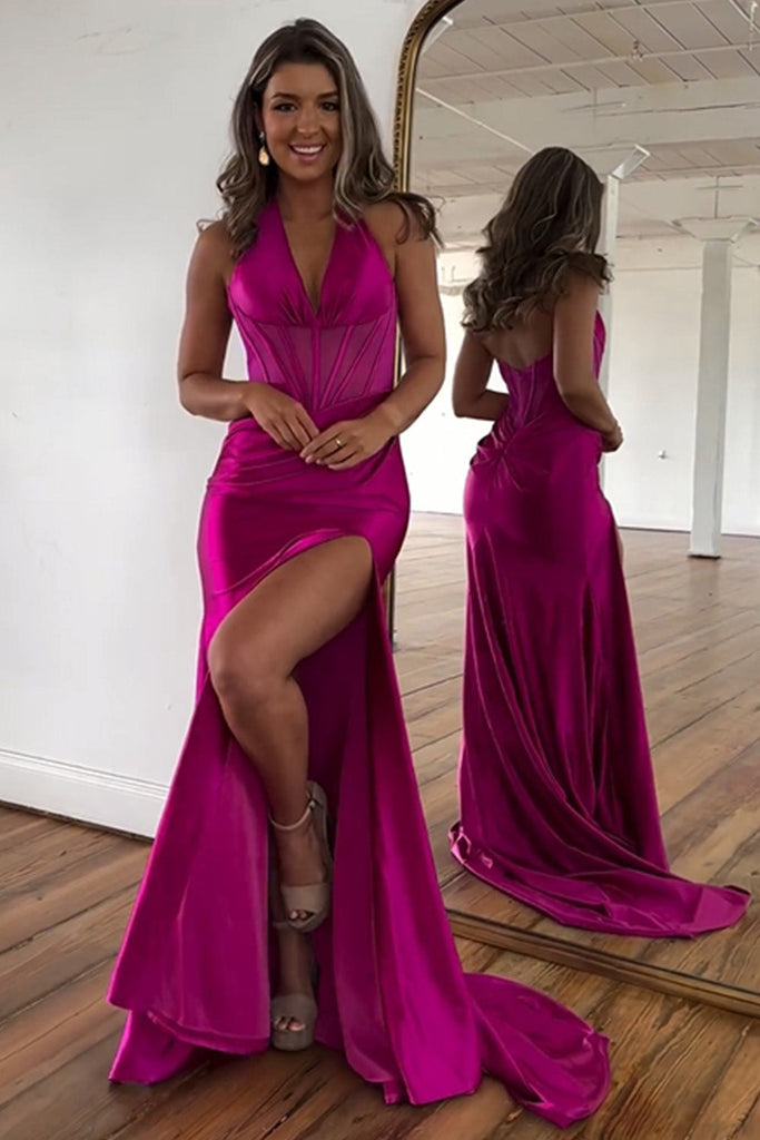 Fuchsia Mermaid Halter Neck Backless Long Satin Prom Dress With Split