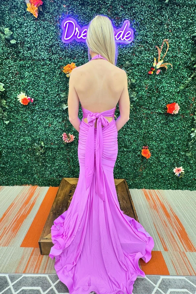 This elegant light blue mermaid prom dress features a halter neck and a backless design, crafted from smooth satin for a flattering silhouette. Its long length enhances sophistication, while the delicate bowknot adds a refined, feminine touch. Ideal for formal events, this gown balances timeless style with modern allure.