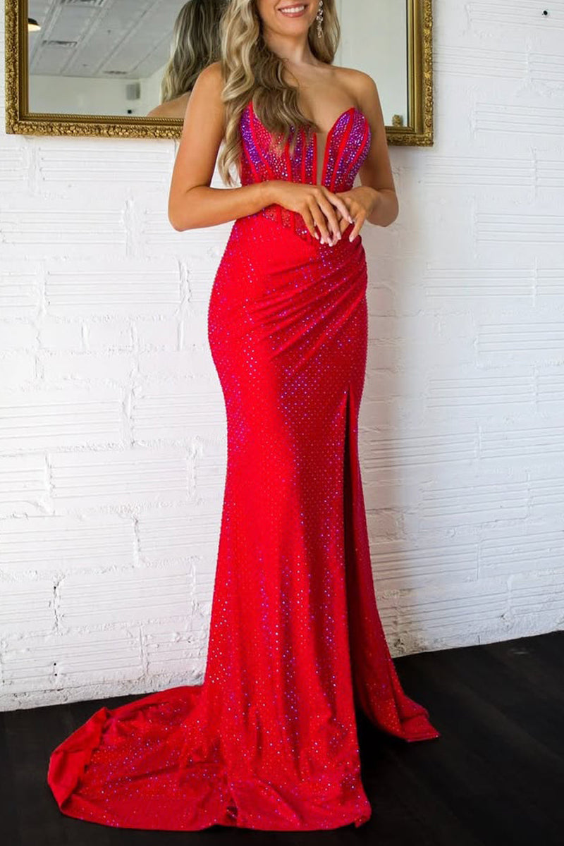 Mermaid Sweetheart Red Satin Beaded Long Prom Dresses with Slit - Red está en espera y se enviará tan pronto como vuelva a estar en stock