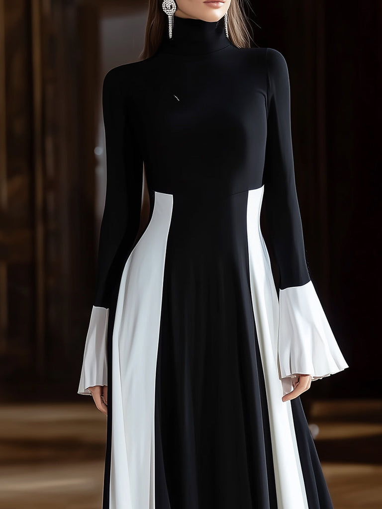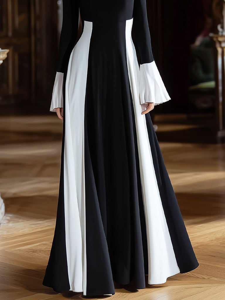 Black And White Contrast Panel Evening Gown With Flared Sleeves