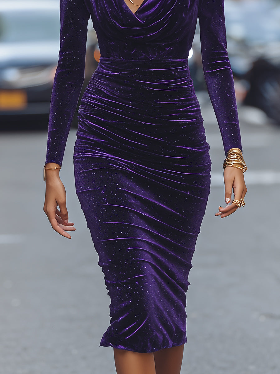 • Design: Draped cowl neckline, velvet choker accent, ruched bodice and skirt, fitted sleeves, body-contouring silhouette