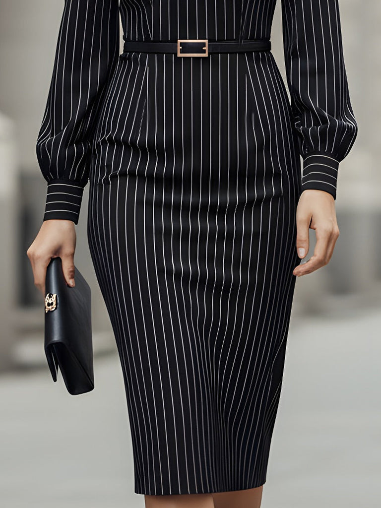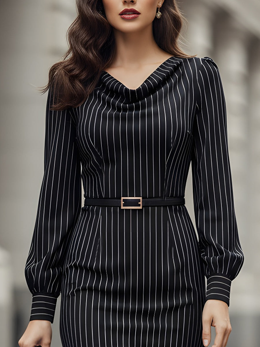 KOCKU presents the timeless sophistication with this elegant pinstripe midi dress. Designed with a flattering bodycon fit, it features vertical white stripes that elongate the silhouette and add a touch of classic charm. The draped neckline and long sleeves create a graceful look, while the adjustable waist belt cinches the waist for a flattering finish.