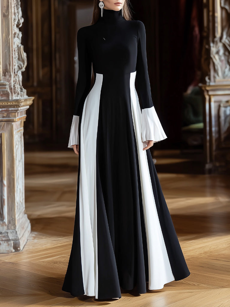 Black And White Contrast Panel Evening Gown With Flared Sleeves