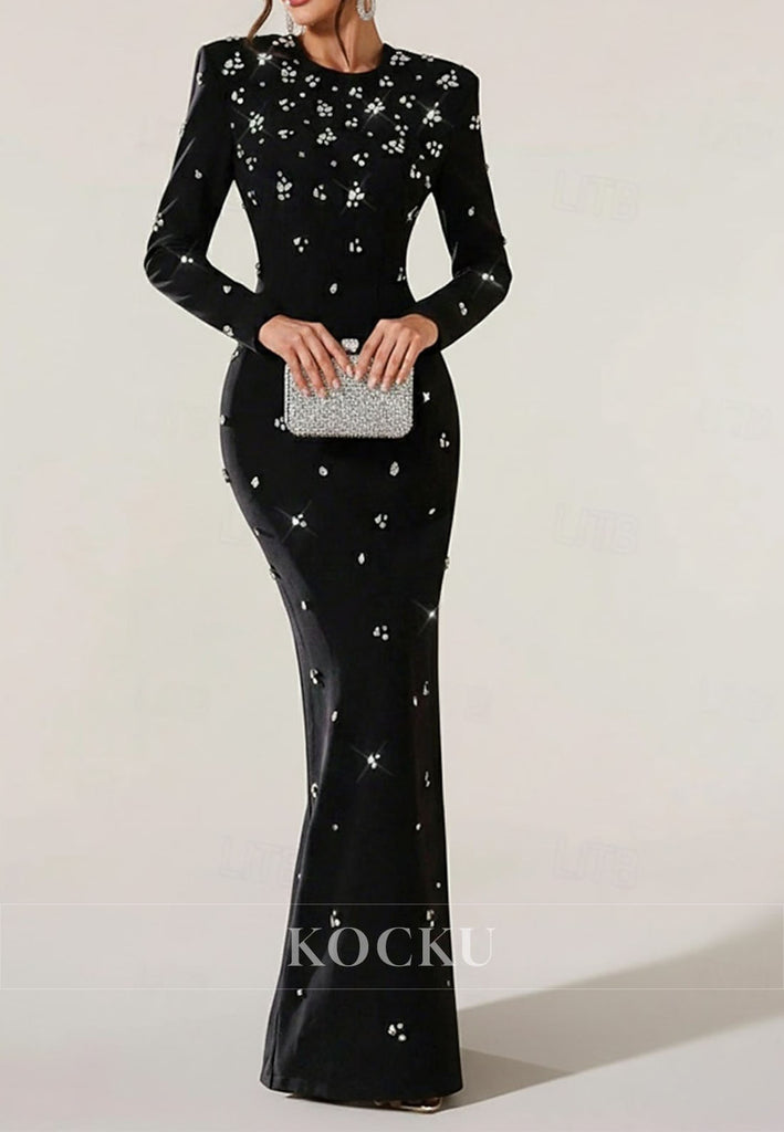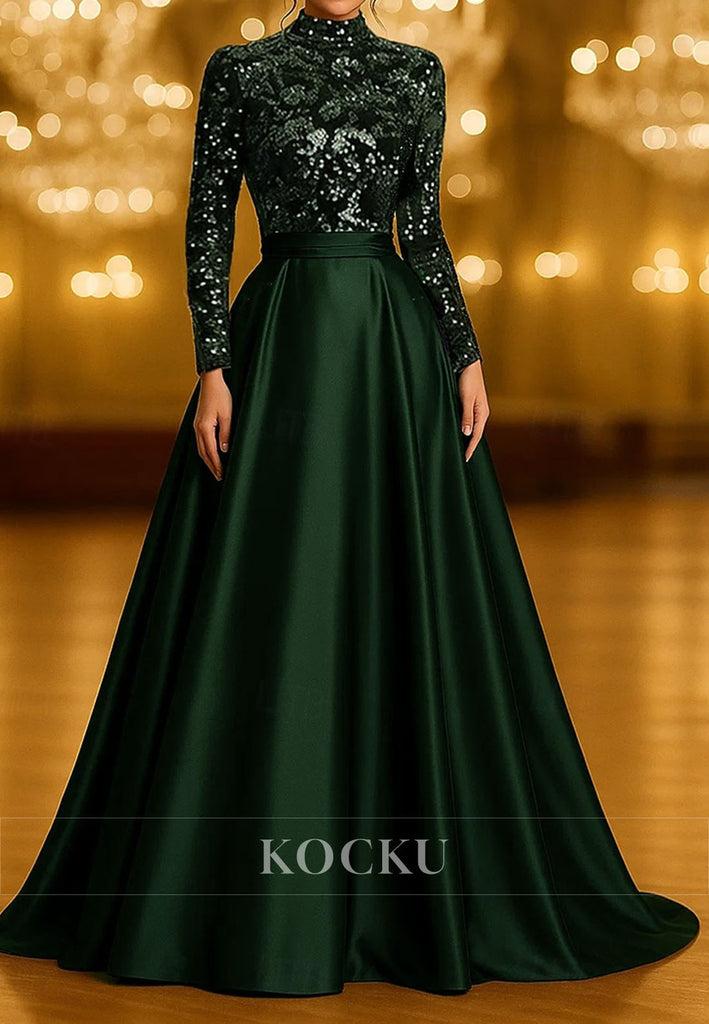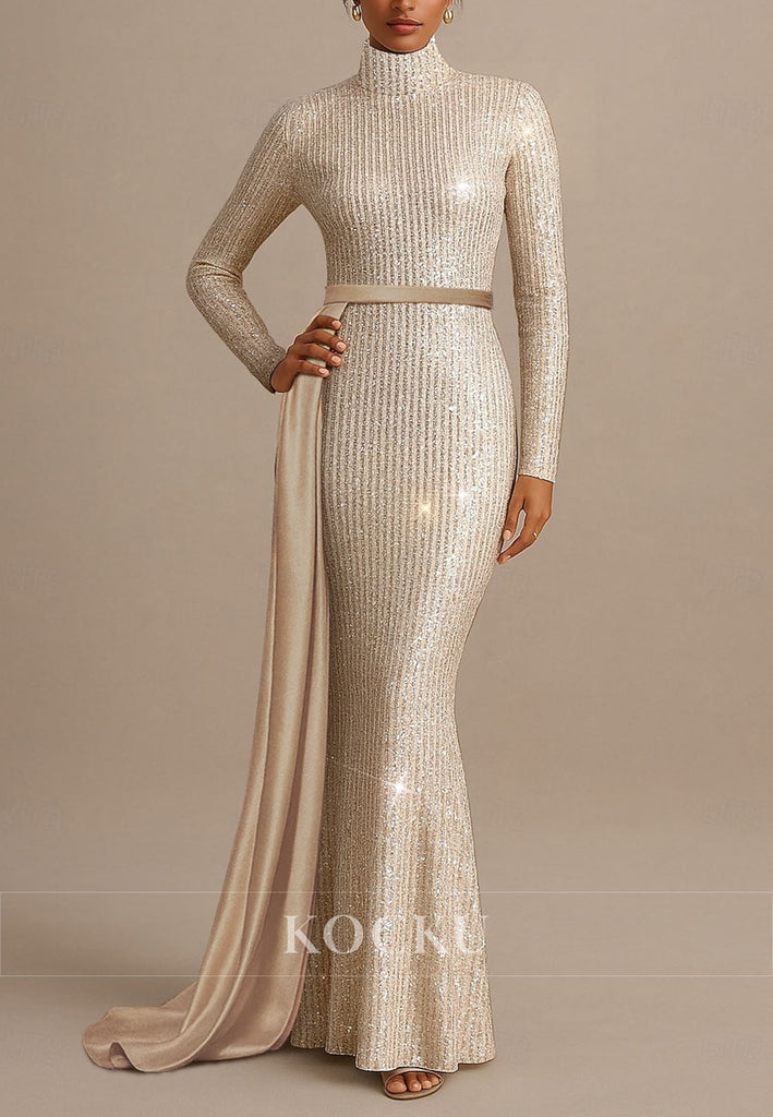Mermaid Floor Length Evening Gown Long Sleeve High Neck Formal Wedding Sequined Mother of the Bride Dress