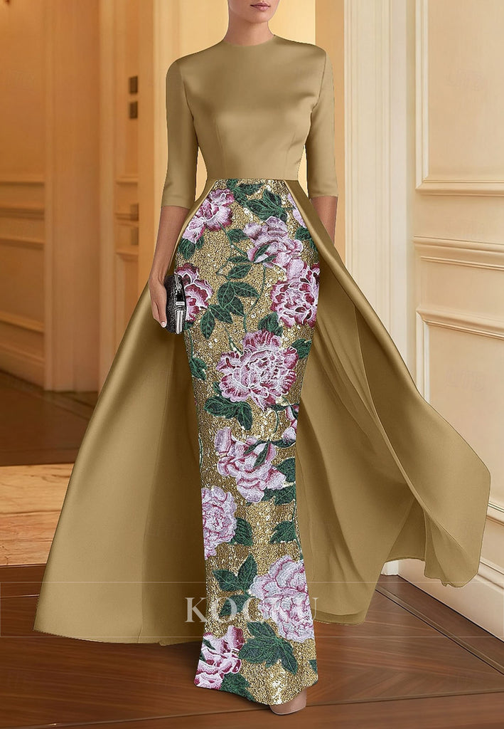 A-Line Floor Length Evening Gown Glittering Sparkle Half Sleeve Crew Neck Mother of the Bride Dress