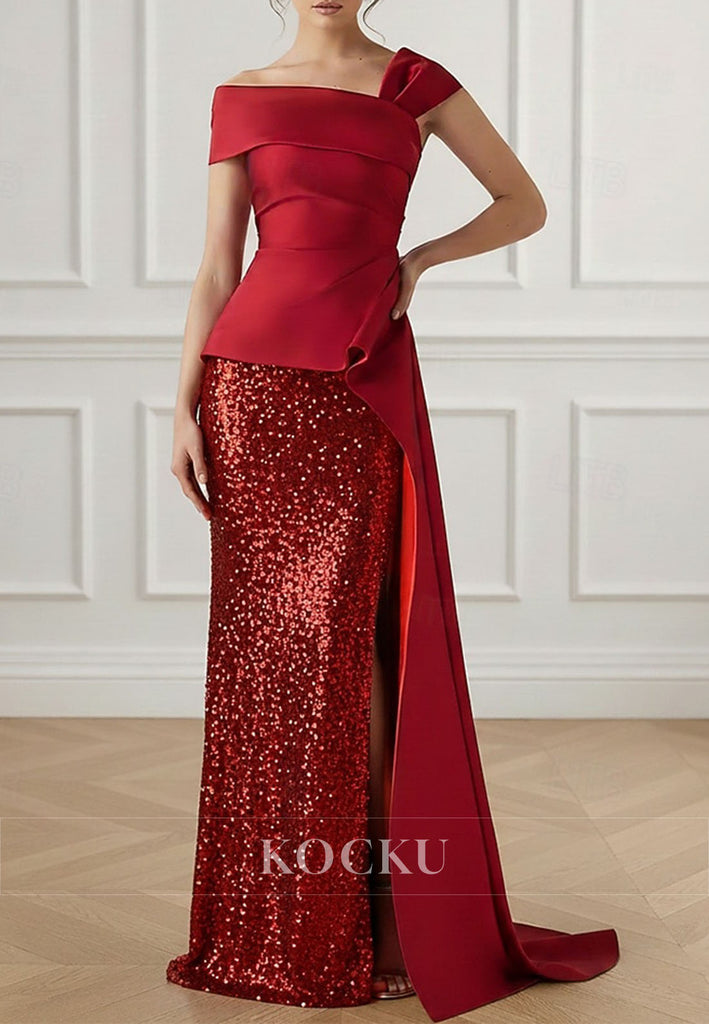 Asymmetrical Neck Pleated Side Slit Sequins Back Zipper Sheath Mother of the Bride Dress
