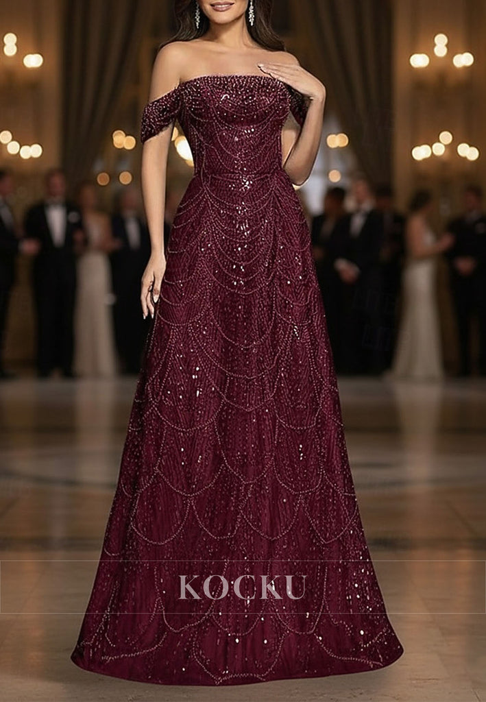 A-Line Off Shoulder Beaded Sweep Train Evening Gown Mother of the Bride Dress