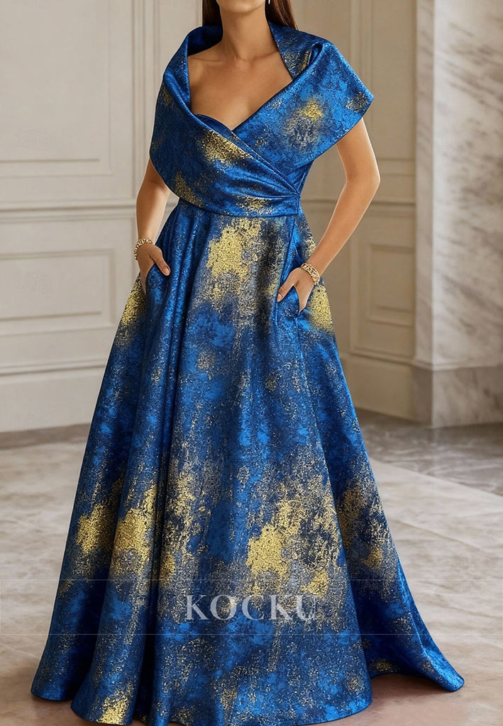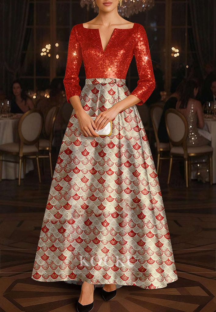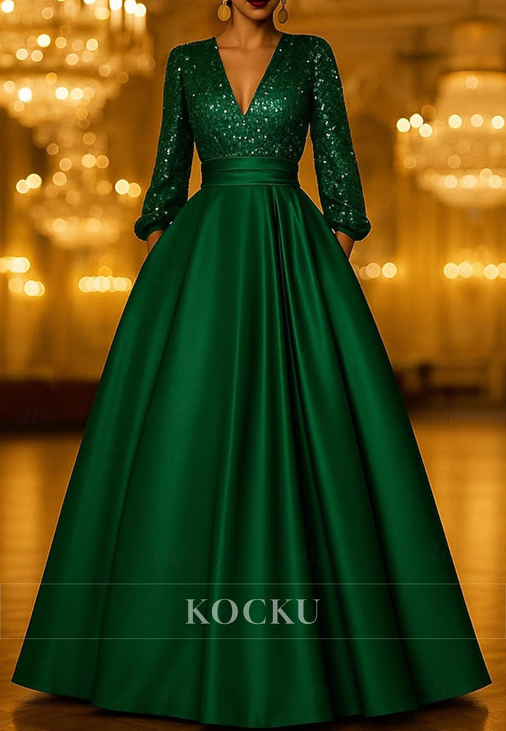 A-Line Floor Length Evening Gown Long Sleeve V Neck Pocket Satin Sequined Mother of the Bride Dress