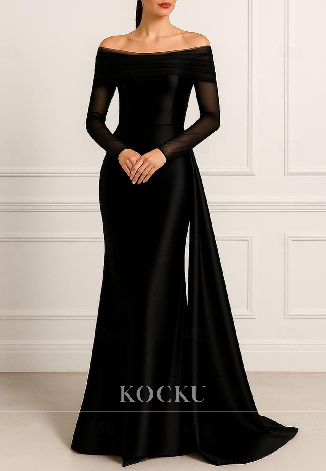 Elegantly designed for the mother of the bride, this sophisticated evening gown features an off-shoulder neckline and long sleeves that exude timeless grace. The streamlined mermaid silhouette flatters the figure while the back zipper closure ensures a polished fit. Crafted with refined simplicity, this dress strikes the perfect balance between understated elegance and statement-making style, making it an ideal choice for formal celebrations and special occasions.