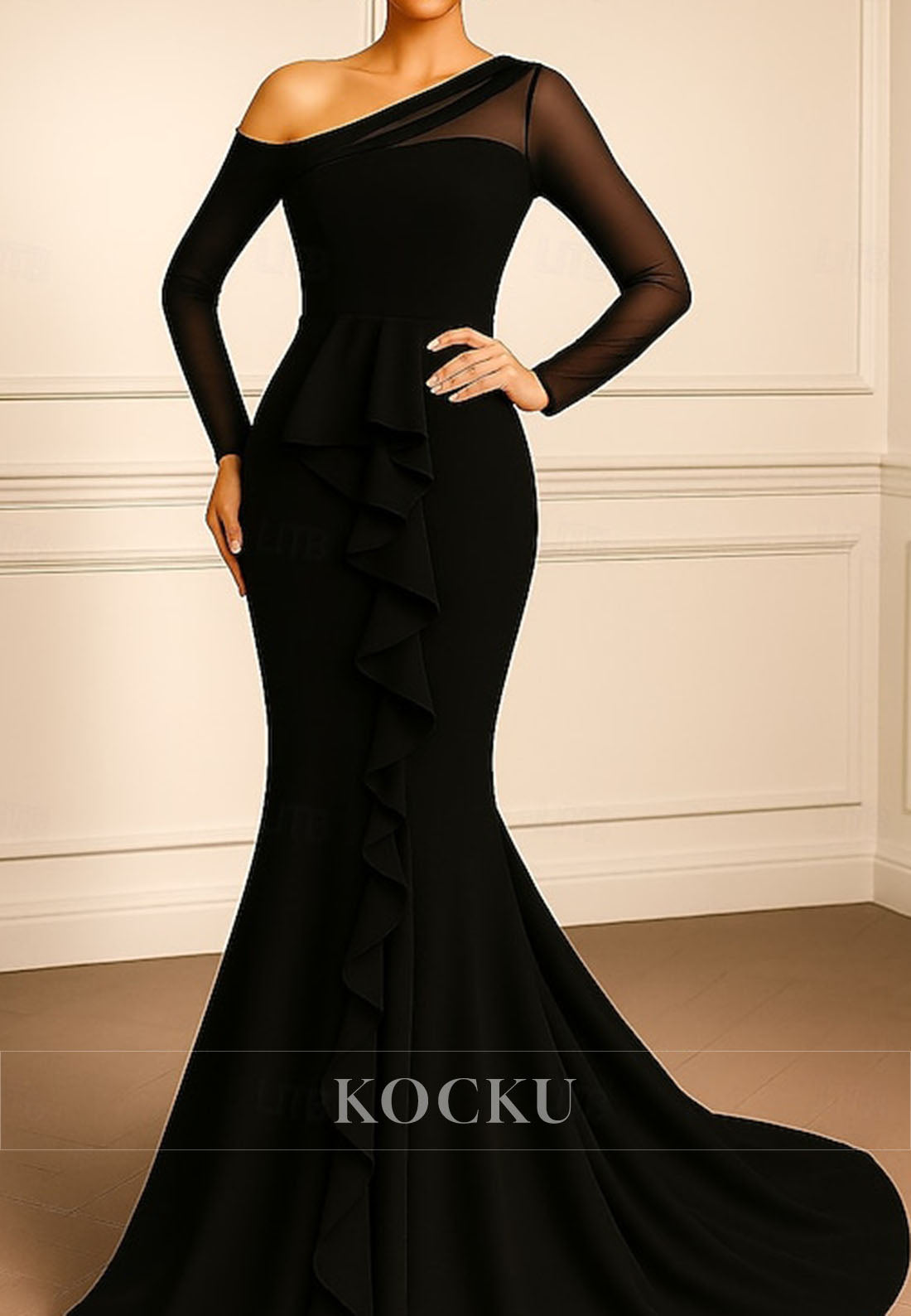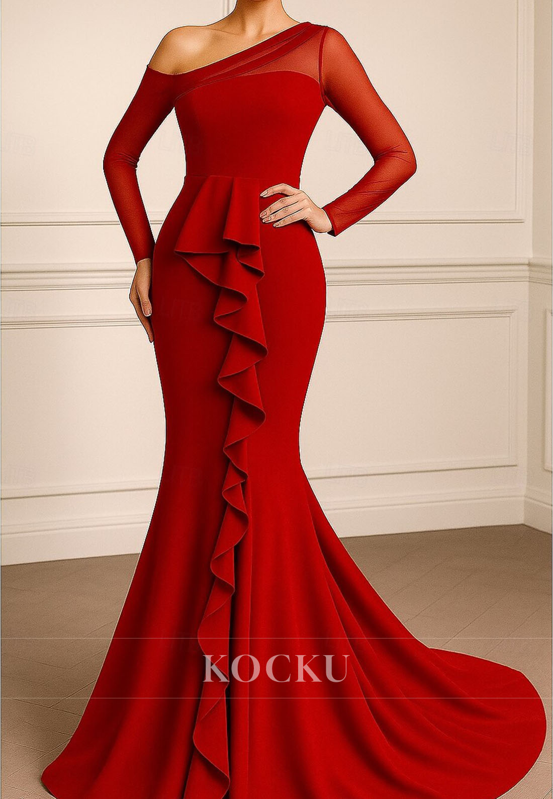 Make a stunning impression in this sophisticated mermaid evening gown designed for the mother of the bride. The asymmetrical one-shoulder neckline and luxurious long sleeves create an air of refined elegance, while cascading ruffles add movement and dimension throughout the silhouette. The fitted mermaid cut hugs the body beautifully before flowing into a dramatic hem, ensuring you command attention at any formal occasion. Perfect for mothers who desire a show-stopping look with timeless glamour and contemporary style.