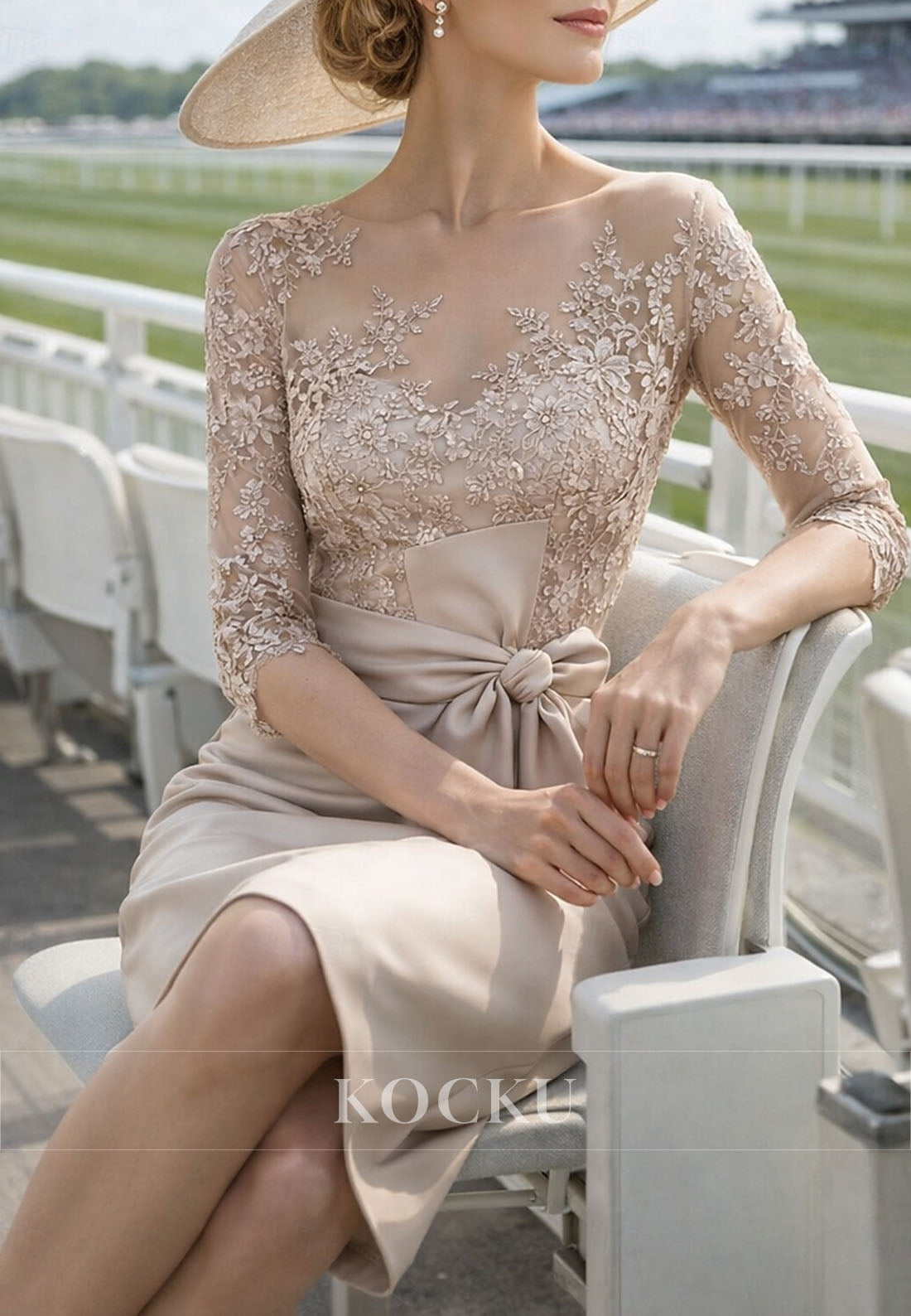 Champagne Illusion Neck Half Sleeves Bowknot Mother of the Bride Dress