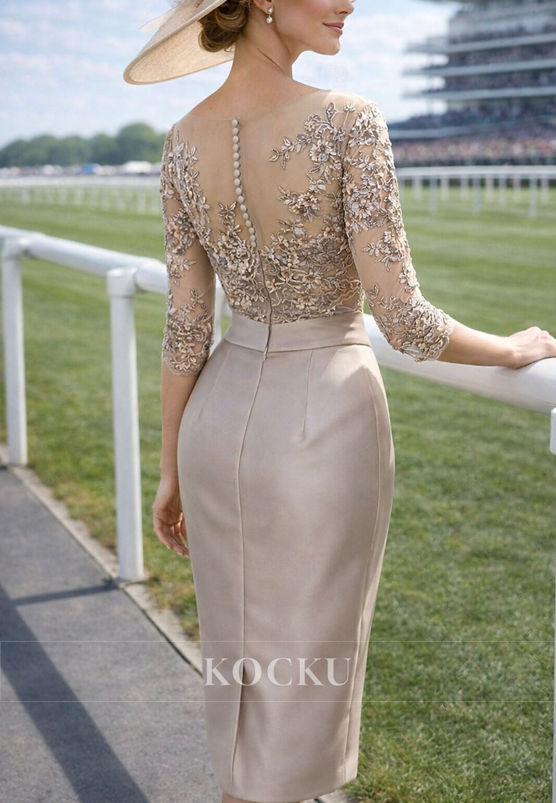 Radiant and refined, this champagne mother of the bride dress exudes timeless elegance. The illusion neckline creates a sophisticated frame, while delicate half sleeves offer graceful coverage. A charming bowknot detail adds feminine flair to the A-line silhouette that flatters every figure. The decorative floral hem brings movement and visual interest to this classic design. Ideal for weddings and milestone celebrations, this dress balances traditional beauty with contemporary touches for an unforgettable appearance.