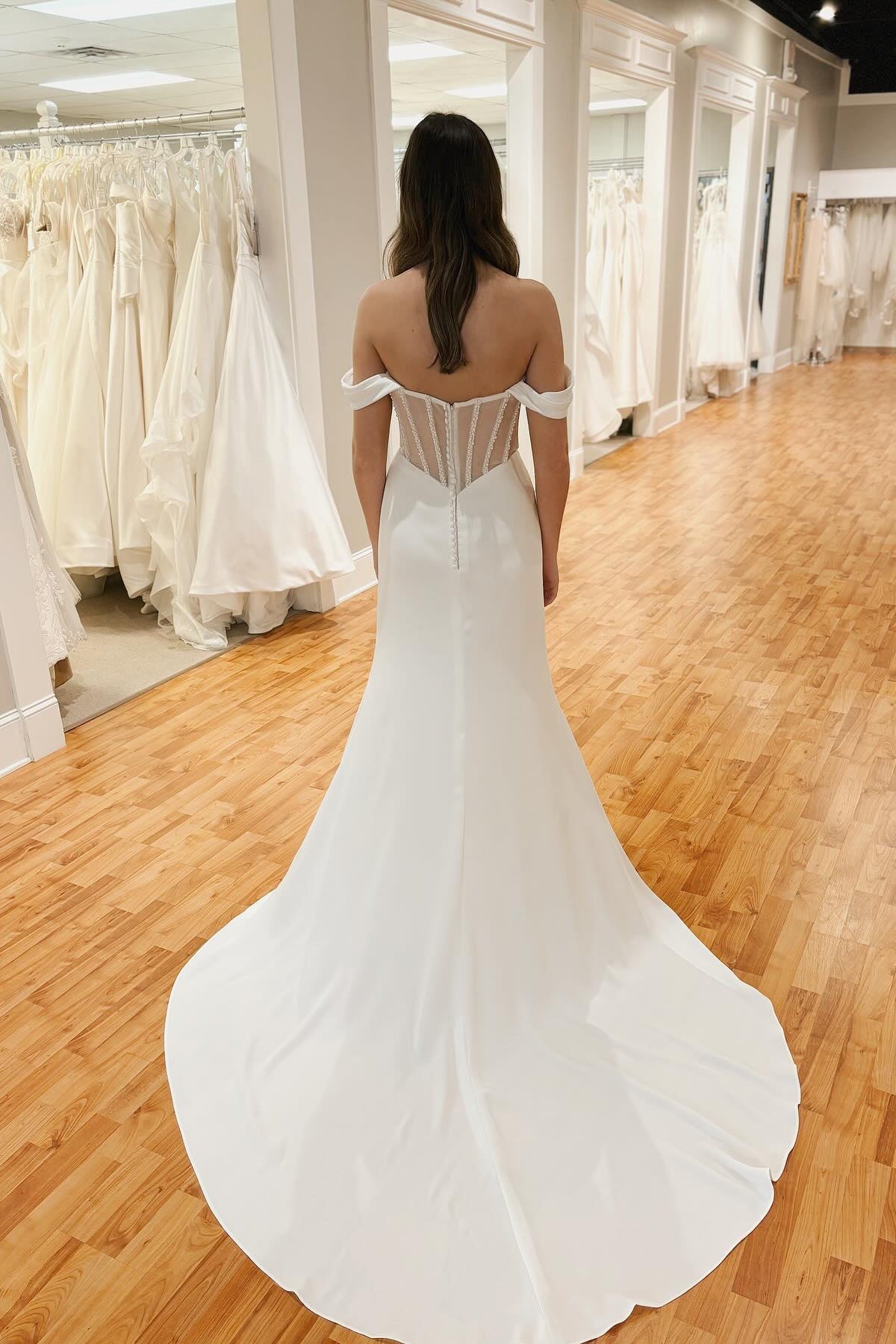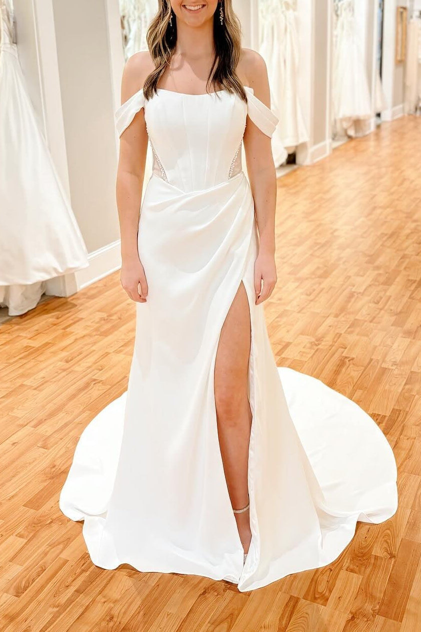 This sophisticated wedding gown is crafted from white satin and features a mermaid silhouette. It includes a sheer bodice adorned with delicate beading and an off-the-shoulder design. The dress is finished with a zip-up back, floor-length hem, and a built-in bra for added support.