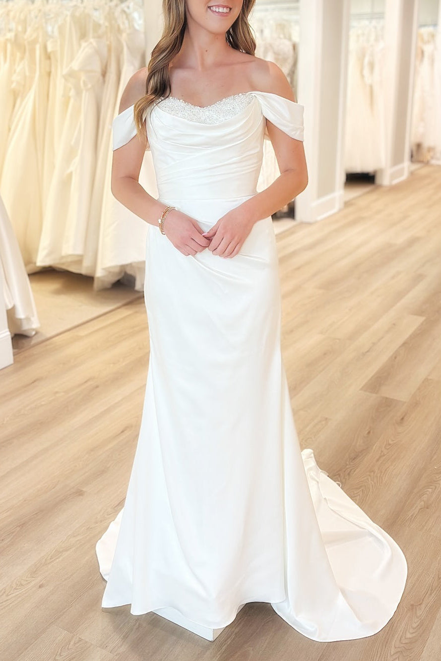 This elegant wedding dress is crafted from white satin and features a mermaid silhouette. It showcases a corset bodice with a beaded neckline and an off-the-shoulder design. The floor-length gown includes a built-in bra for added support, offering a sophisticated bridal look.