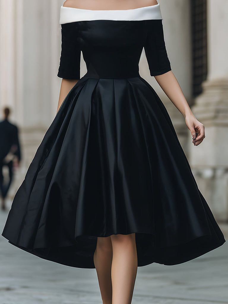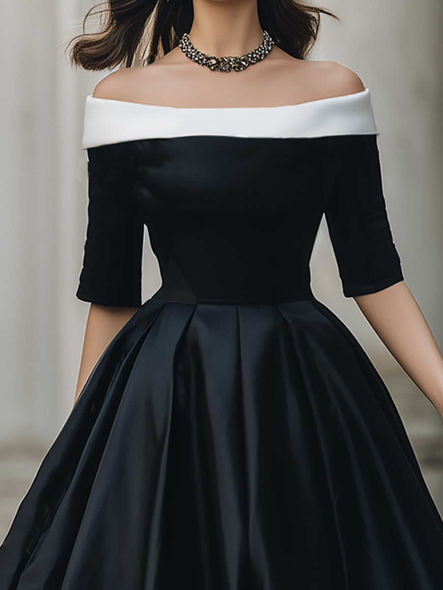 Elegant and timeless, this black and white off-shoulder midi dress embodies refined sophistication with a modern edge. The fitted bodice, crafted from a comfortable stretch fabric, beautifully sculpts the upper body while offering effortless movement. The off-shoulder neckline, accentuated by a crisp white fold-over band, adds a touch of classic allure.