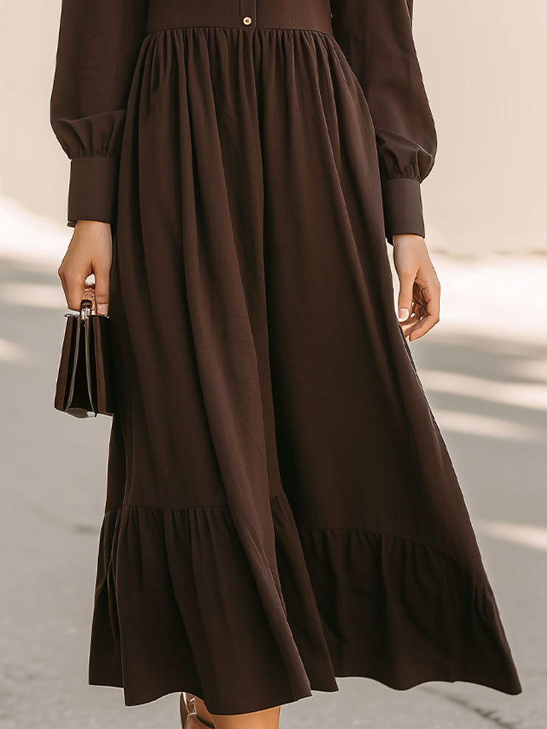 Elegant Chocolate Brown Shirt-Collar Midi Dress With Puff Sleeves
