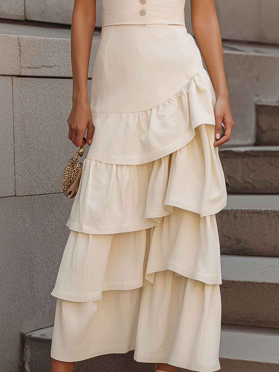 The ivory tiered ruffle midi dress, designed with a sleek V-neckline and a fitted bodice that beautifully contours the waist. Decorative gold buttons add a polished touch to the front, enhancing the dress’s refined elegance. The cascading tiered ruffle skirt creates graceful movement with every step, blending playful charm with sophisticated femininity. This sculpted yet airy silhouette makes it the perfect choice for garden parties, weekend brunches, or stylish city afternoons.