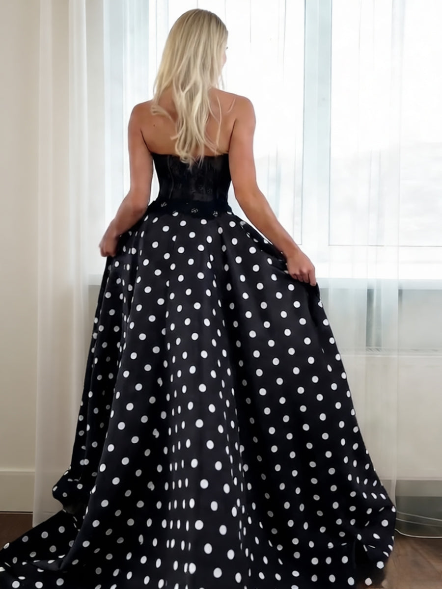 A-Line Strapless Polka Dot Long Prom Dress with Illusion Lace