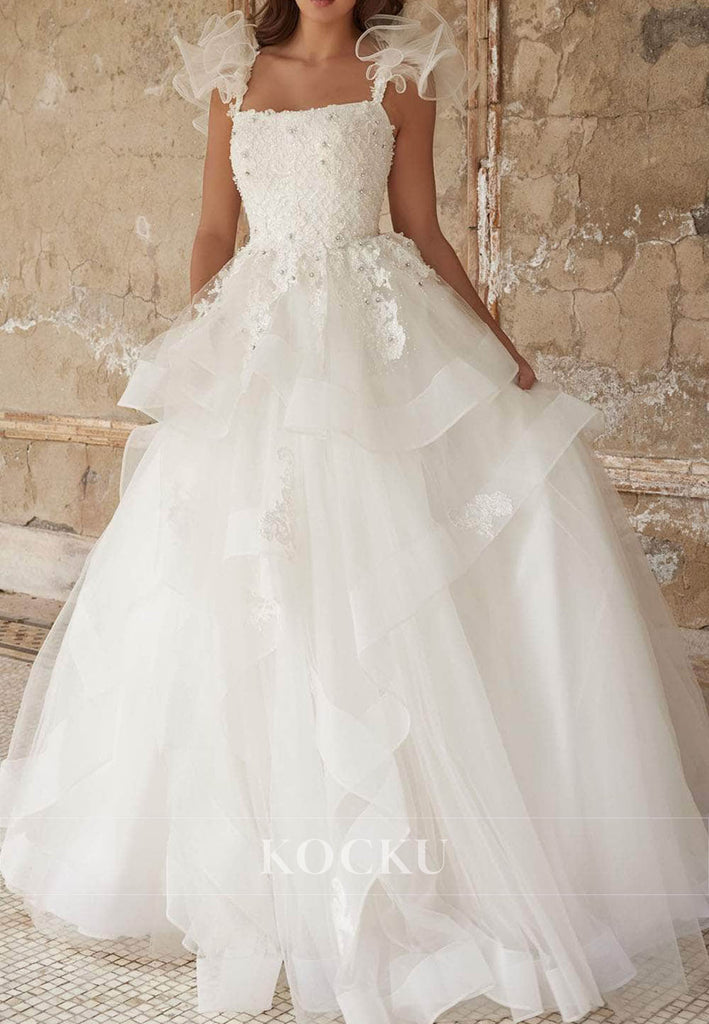 A-Line Square Neck Sweep Train Ruffles Back Zipper Wedding Dress