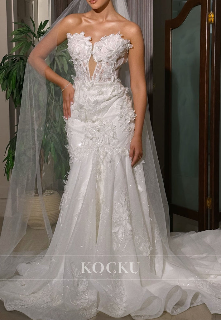 Mermaid Sweetheart Appliqued Chapel Train Wedding Dress with Sleeves