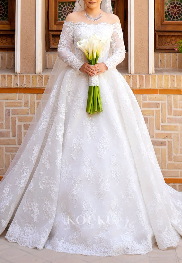 A-Line Off Shoulder Long Sleeves Court Train Beaded Lace Wedding Dress