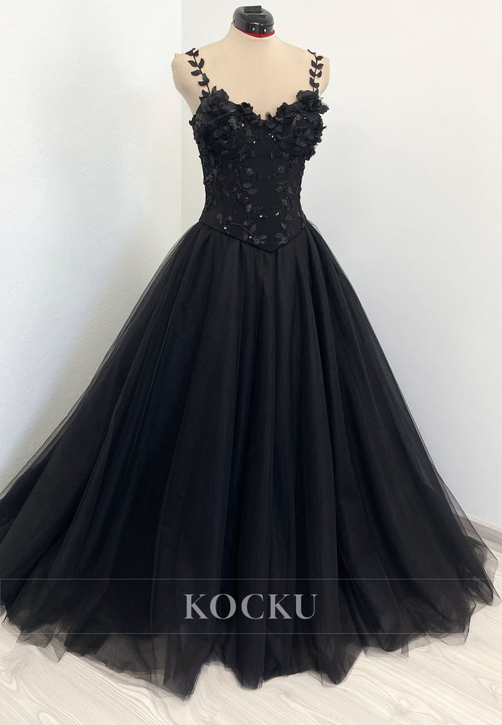 Black Swetheart Sleeveless Floral A-Line Tulle Wedding Dress
