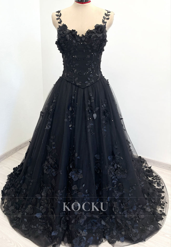 Black Sweetheart Floral Sleeveless A-line Court Train Wedding Dress