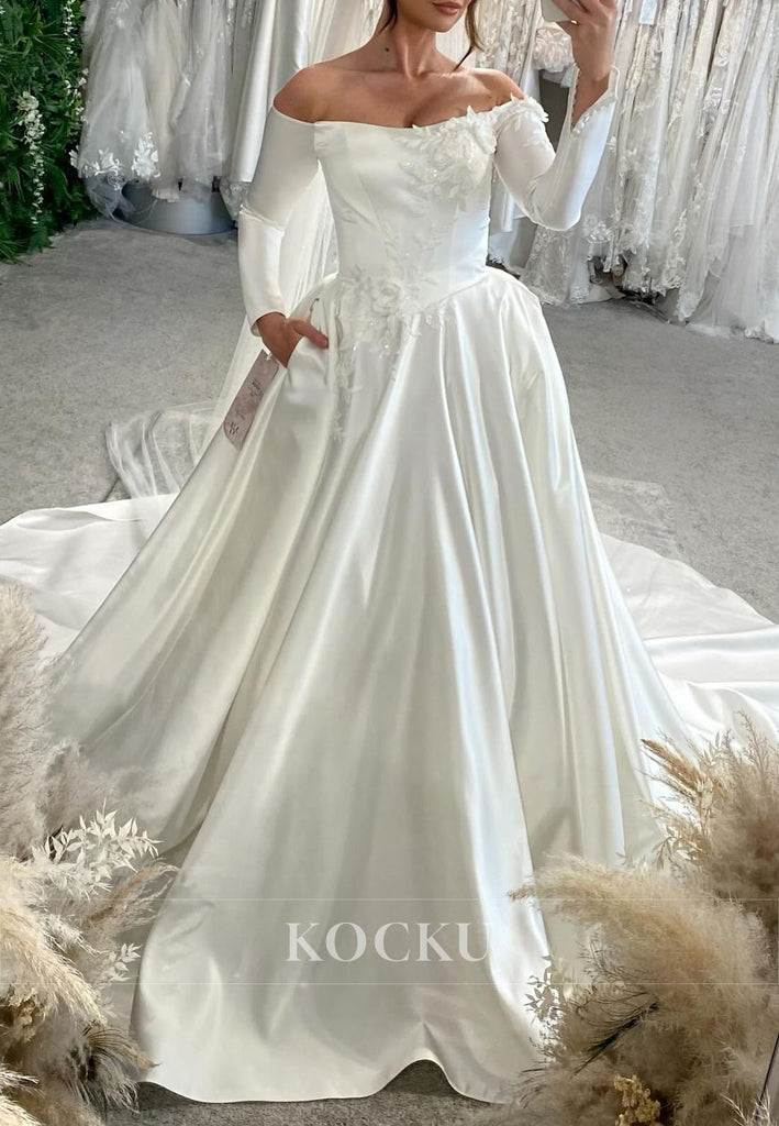 Lace Appliqued Long Sleeves Off Shoulder Court Train Wedding Dress