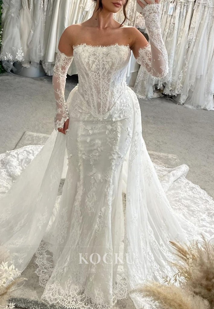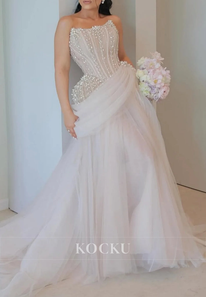 Timeless Strapless Lace Wedding Dress with Pearl Accents and Train