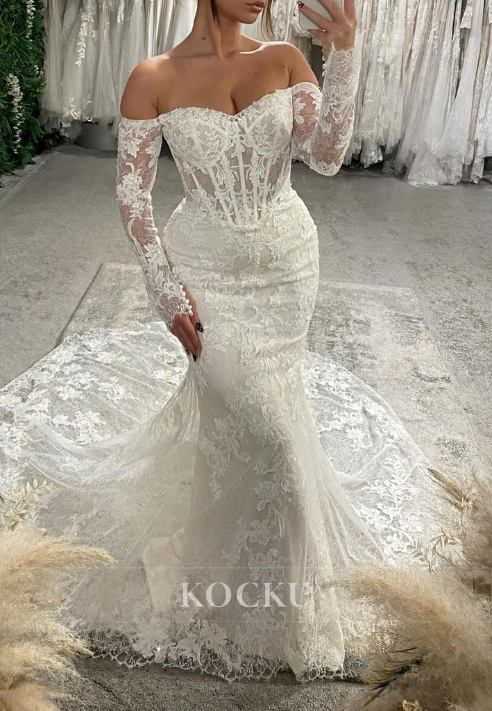 Mermaid Off Shoulder Long Sleeves Appliqued Lace Court Train Wedding Dress
