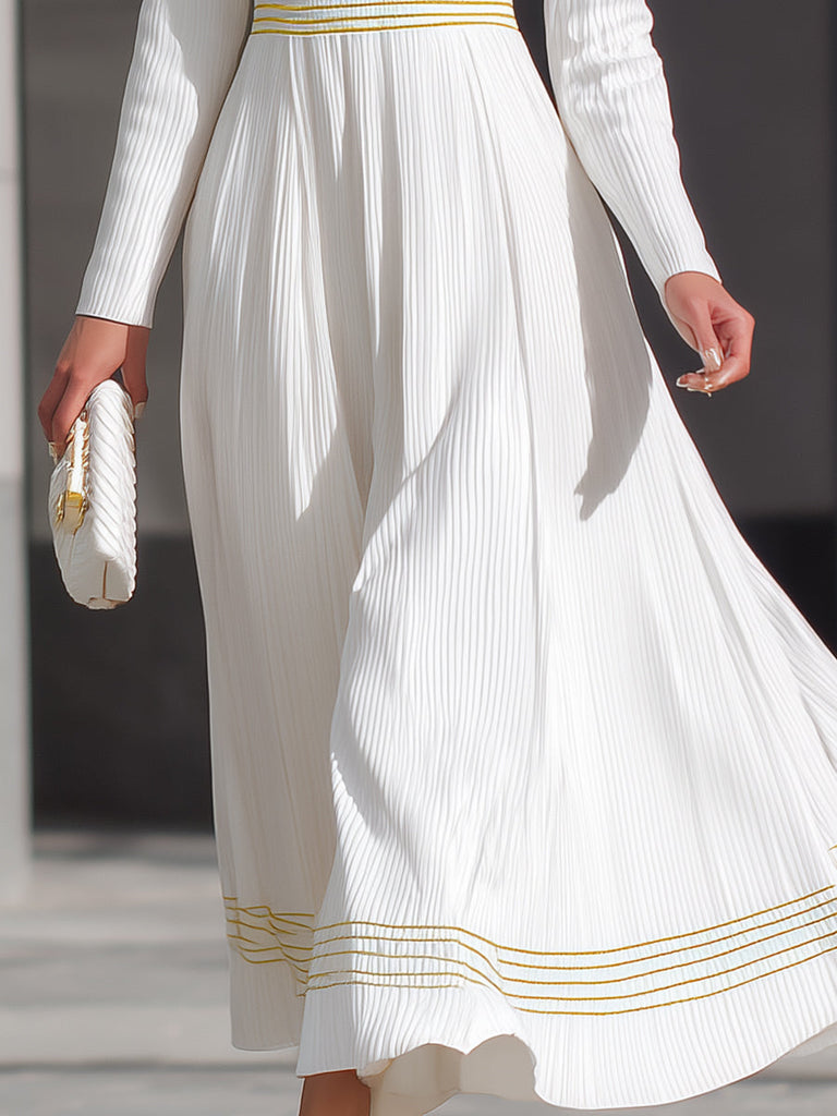 This sophisticated white pleated dress features striking yellow stripes that add a playful yet elegant touch. The deep V-neckline and long sleeves are complemented by a waist-cinching yellow belt, creating a flattering silhouette.