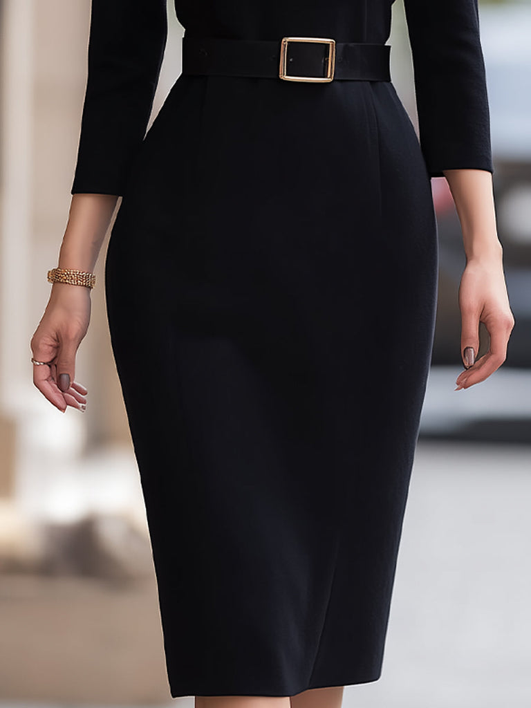 KOCKU presents the Sophisticated Black Sheath Midi Dress, crafted for the modern professional woman. The dress features a classic round neckline, three - quarter sleeves, and is cinched at the waist with a black belt adorned with a gold - tone square buckle, merging timeless professionalism with chic elegance. Made from smooth, structured fabric, this midi dress effortlessly combines comfort with a polished, refined look.